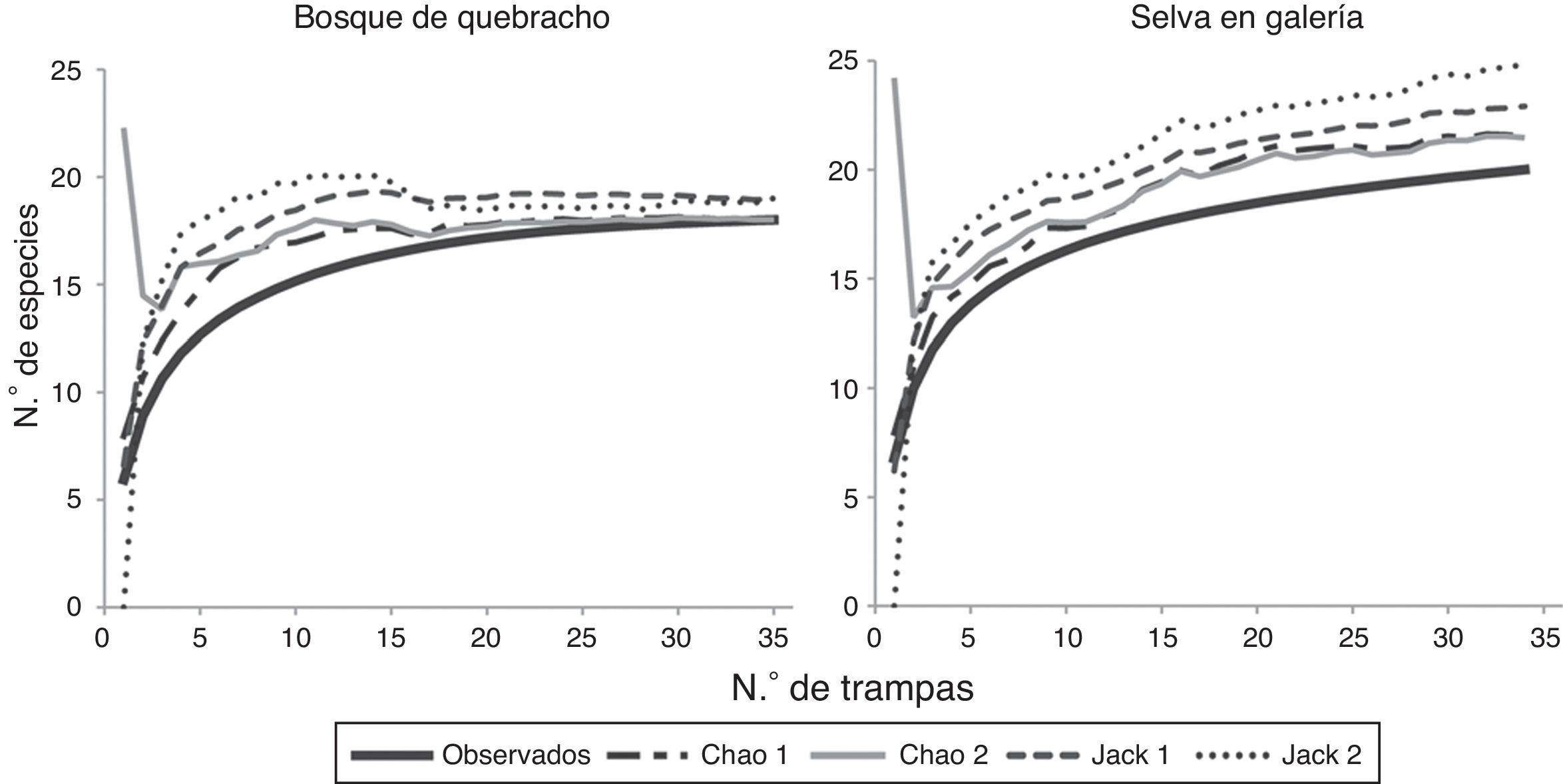 De acuerdo con los estimadores no paramétricos Chao1 y Chao2, se alcanzó una eficiencia de captura del 95% en la selva en galería y del 100% en bosque de quebracho (fig. 2). En la selva, Jacknife de primer y segundo órdenes predijeron 23 (87%) y 25 (81%) especies respectivamente, y para el bosque de quebracho ambos estimaron 19 especies (95%). La eficiencia de muestreo fue superior en el bosque de quebracho debido a la presencia de un mayor número de especies con un solo individuo en la selva. La cobertura de muestreo estimada para la selva y el bosque de quebracho fue del C = 0.998 y C = 0.999, respectivamente. El estimador de Shen et al. (2003) predijo que se necesitaría capturar otros 750 individuos para recolectar una nueva especie en la selva; mientras que para el bosque de quebracho, un incremento de captura de 1,500 ejemplares no asegura el hallazgo de otra especie.