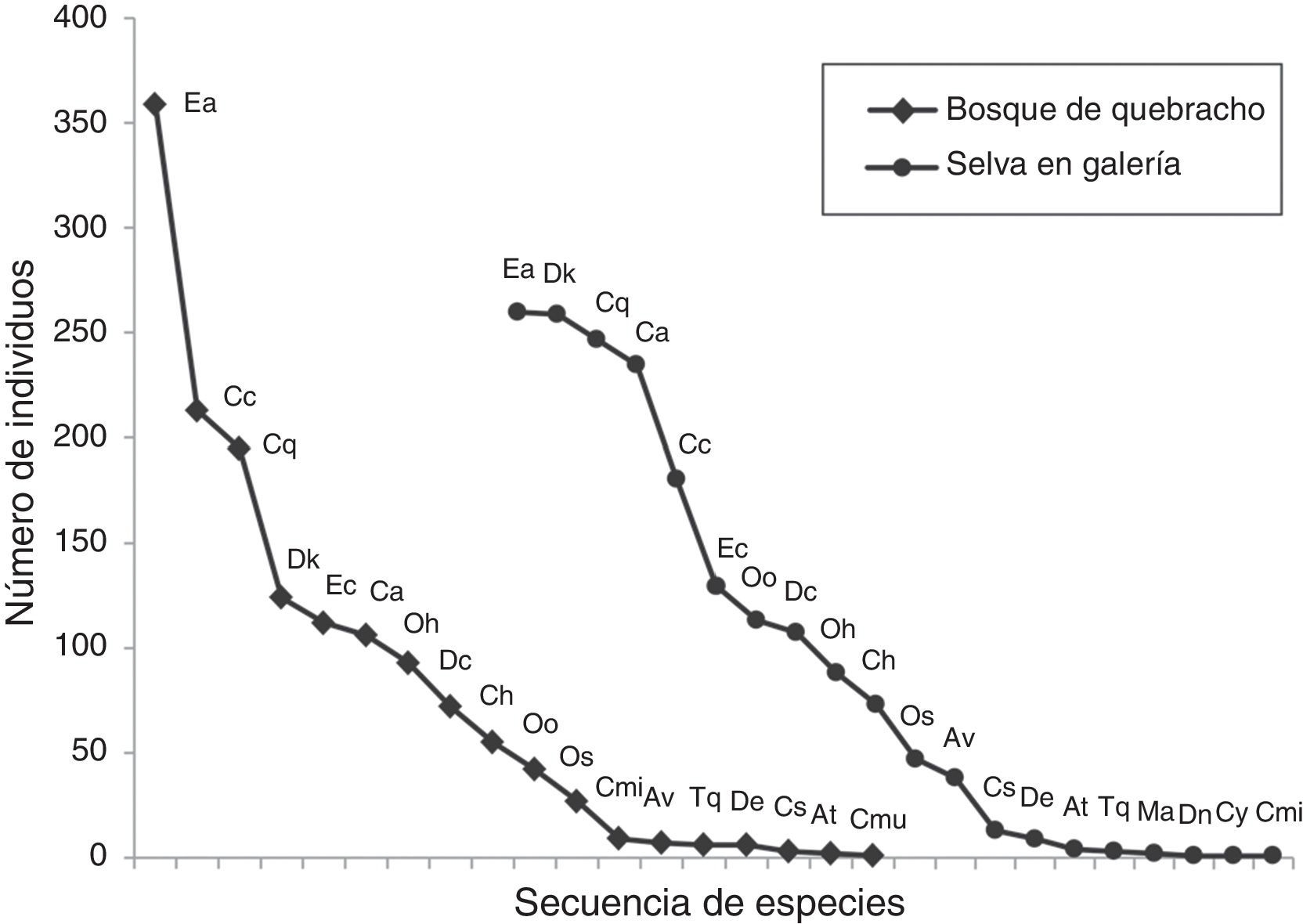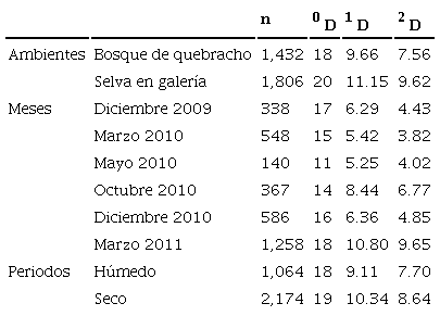 El análisis multivariado y las curvas de rango-abundancia no mostraron diferencias en la composición de escarabajos capturados en los distintos ambientes. Esta semejanza de los ensambles podría deberse a que entre la selva en galería y el bosque de quebracho no hay límites de separación definidos, y se desarrollan bajo un mismo dosel vegetal que permite un flujo constante de individuos. Asimismo, tanto en el bosque de quebracho como en la selva en galería, los valores entre la diversidad 1 D y 2 D no variaron considerablemente, lo que indica una composición equitativa de especies con abundancias altas e intermedias. En cambio, fue mayor la diferencia de los valores 0 D con respecto a 1 D y 2 D, debido al gran número de especies raras, las cuales se ven representadas hacia el final de las curvas de rango-abundancia. Este modelo, en el que se registran muchas especies raras, es característico de los bosques tropicales con estaciones secas y húmedas definidas (Halffter, 1991).
