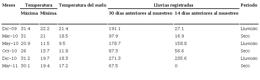 Los mayores valores de riqueza, abundancia y diversidad se obtuvieron en marzo de 2011, un mes de elevadas temperaturas y escasas lluvias. Se comprobó que la temperatura fue la variable que más influyó en el ensamble. Hernández y Vaz de Mello (2009), quienes trabajaron en áreas montañosas con predominio de bosque mesófilo, también demuestran la importancia de esta variable en el incremento del número de especies. No se registró correlación entre la composición del ensamble y las precipitaciones. Resultados similares han sido encontrados por Orozco y Pérez (2008) en 2 bosques (seco premontano y montañoso húmedo), aunque difieren con los de otros autores (Barbosa-Silva, Hernández, Ide y Moura, 2007; Bustos-Gómez y Lopera-Toro, 2003; Damborsky et al., 2015; Martínez, 2010; Milhomem, Vaz de Melo y Diniz, 2003) quienes encontraron la mayor riqueza y abundancia de especies durante los periodos lluviosos. Escobar (2000) destaca que las variaciones de la comunidad de escarabajos coprófagos entre periodos dependen también de los ambientes, y no encuentra relación entre la riqueza y los niveles de precipitación en bosques de montaña.