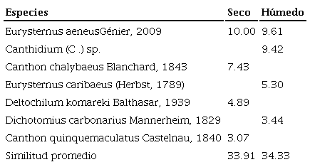 De acuerdo con el procedimiento SIMPER, las especies que contribuyeron con la similaridad de cada estación fueron: E. aeneus , Canthidium (C .) sp., E. caribaeus y D. carbonarius que caracterizaron al periodo lluvioso, y aportaron el 80% de la abundancia (tabla 4), esta última especie mostró marcados picos poblacionales en los meses húmedos, registrándose en los meses de diciembre (2009 y 2010) el 81% de su abundancia. E. aeneus, C. chalybaeus , D. komareki y C. quinquemaculatus caracterizaron al periodo seco y representaron el 75% de la abundancia.