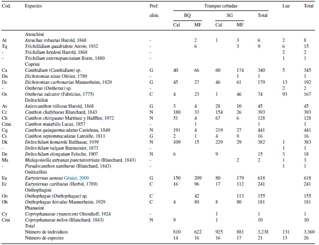 En las trampas cebadas se recolectaron 3,238 ejemplares y 21 especies. Eurysternus aeneus Génier fue la especie dominante, con una abundancia del 18.4% en relación con el total de los ejemplares capturados, seguido por Canthon quinquemaculatus Castelnau (13.1%), Canthon chalybaeus Blanchard (11.7%), Deltochilum komareki Balthasar (11.4%) y Canthidium (Canthidium ) sp. (10.2%), que agruparon el 65% del total de individuos recolectados; estas especies, junto a Canthon chiriguano Martínez y Halffter, Onthophagus hirculus Mannerheim, Ontherus sulcator (Fabricius) y Anisocanthon villosus Harold, se capturaron en todos los muestreos.