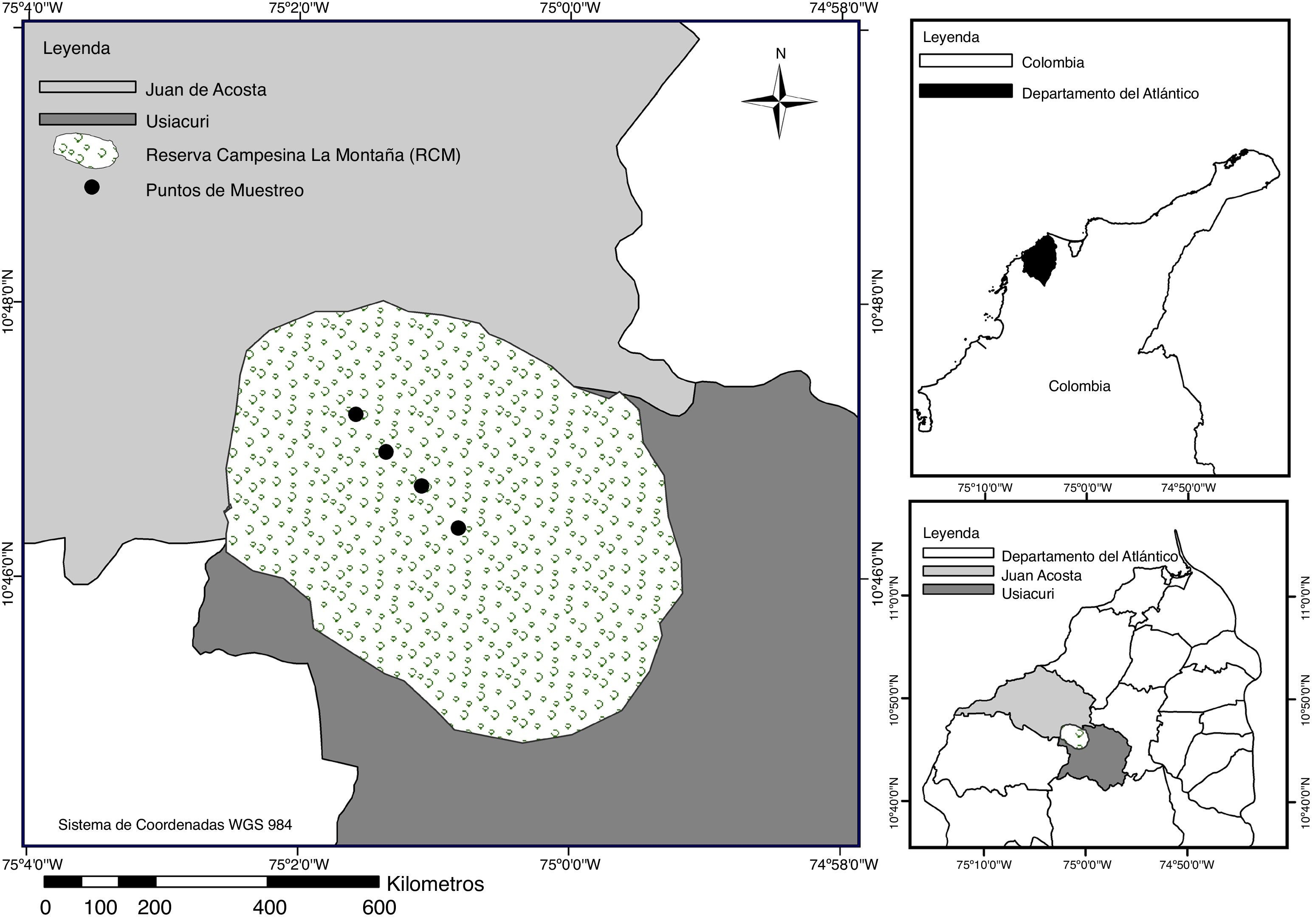Con una extensión de 47 ha, la RCM, declarada así desde 1996 (Decreto 1777), se encuentra en el municipio de Juan de Acosta, departamento del Atlántico, Colombia (fig. 1). Se localiza a 10°46'2.6" N, 75°02'34" O, a una altitud que oscila entre 177 y 250 m, y es parte del distrito Montes de María y Piojó, en la región biogeográfica del Cinturón Árido Pericaribeño (Hernández, 1992). Se trata de un BST con condiciones higrotropofíticas (Holdridge, Grenke, Hatheway, Liang y Tosi, 1971). Su relieve es ondulado, y forma parte de los ecosistemas de serranías, con pendientes entre el 12 y el 25%, con un grado de erosión moderado (Panza et al. , 2001). Los meses de mayor precipitación histórica corresponden a agosto y septiembre, con promedios que van desde 100 mm/mes hasta 580 mm/mes, mientras que enero, febrero y marzo corresponden a los meses con menores precipitaciones, que van desde 0 hasta 30 mm/mes. La temperatura alcanza valores mínimos de 25 °C y máximos de 33 °C durante todo el año.