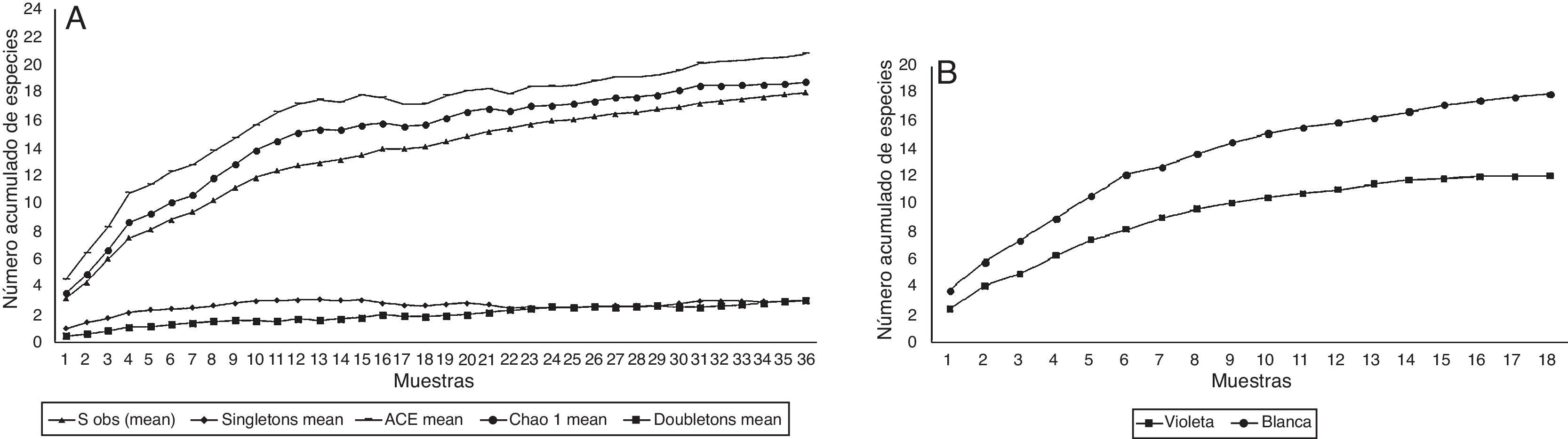 Según los estimadores no paramétricos ACE (19 especies) y Chao1 (21 especies), se capturó entre el 87 y el 99% de las especies de Scarabaeidae fitófagos esperados para la localidad durante el periodo de muestreo y con el esfuerzo utilizado (fig. 2A). Además de esto, el número de las especies Singletons (Paranomala sp.3, Leucothyreus sp.1 y Leucothyreus sp.2) y Doubletons (Cyclocephala ovulum , Strategus aloeus y Phileurus didymus ) se mantienen poco variables a través del tiempo. Las curvas de acumulación de especies observadas por espectro de luz utilizado (fig. 2B) demostraron que la trampa de luz blanca se comportó como una buena técnica de atracción para escarabajos fitófagos de la familia Scarabaeidae "pleurosticti" en el fragmento de BST en el departamento del Atlántico.