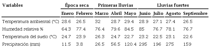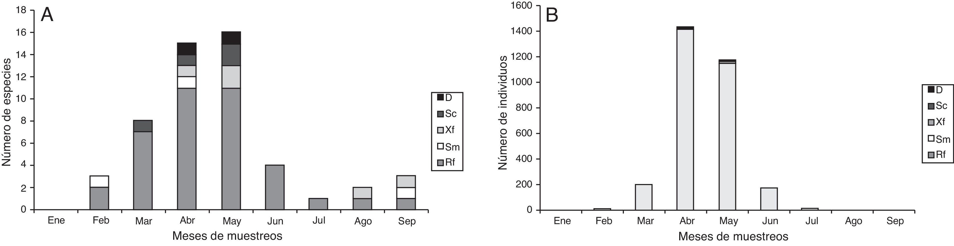 La mayor riqueza y abundancia se presentaron en abril (12 especies y 1,421 individuos) y mayo (15 especies y 1,171 individuos), debido a que la mayoría de las especies recolectadas aparecieron solo en este intervalo de tiempo. Estos valores coinciden con la finalización de las primeras lluvias (> 15 mm y < 150 mm), respectivamente. En estos muestreos, la temperatura ambiente se mantuvo en valores similares (entre 28.7 y 29.4 °C), y la temperatura del suelo, entre los 24.7 y 22.7 °C, respectivamente; mientras que la humedad presentó los valores más altos durante esta época (79.6 y 84.5%) (tabla 2). Por otra parte, la menor abundancia se registró en enero, con la ausencia total de individuos para esta familia (tabla 1). Este mes coincidió con la época seca en la RCM (precipitación = 11.5 mm), con valores bajos de humedad relativa (64.3%).