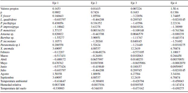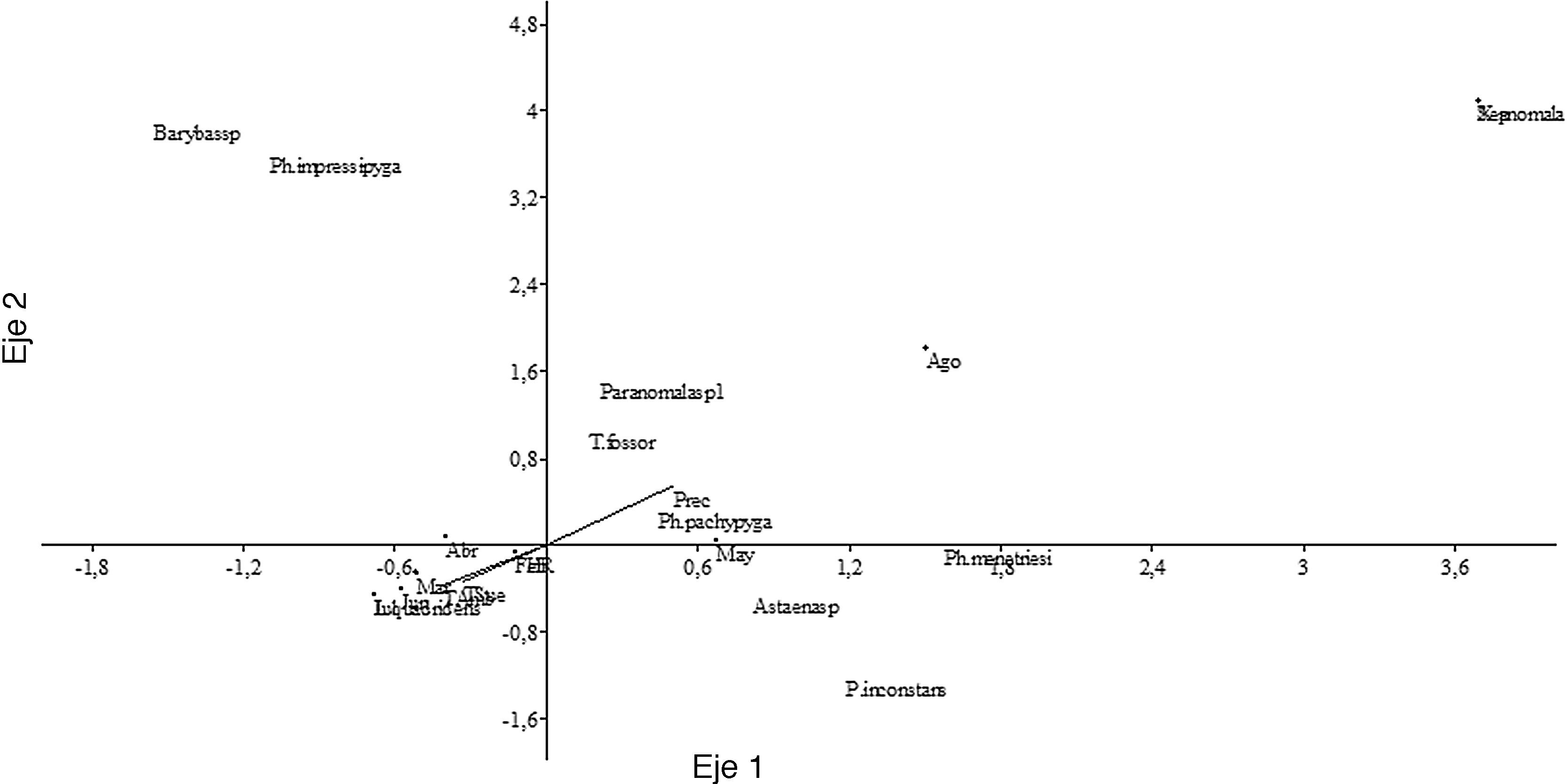 El gremio predominante fue rizofilófago, con el 45.5% de las especies, integrado por los taxones pertenecientes a la subfamilia Melolonthinae y algunas de Rutelinae (Geniatini). Los rizofilófagos alcanzan los valores máximos de riqueza y abundancia en abril y mayo, aunque se encuentran presentes en todos los meses de muestreos (figs. 3A y B). La especie P. didymus , categorizada como xilodepredador, apareció en los meses de mayor riqueza y abundancia, al igual que las especies saprocaulófagas, tales como T. fossor y S. aloeus . Los sapromelífagos (Cyclocephala spp.) y los rizofilófagos (Leucothyreus spp. y Xenopelidnota anomala ) parecen no presentar un patrón definido (fig. 3A). El análisis de correspondencia canónica (fig. 4; tabla 5) corrobora la influencia de los valores de precipitación sobre la aparición de L. quadridens durante los meses de muestreo. Phyllophaga pachypyga , Paranomala sp.1, T. fossor y P. didymus se ven influenciadas por los valores de temperatura ambiental y del suelo.