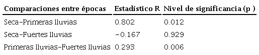 Los mayores valores de diversidad de N1 (4) y N2 (2.83) se presentaron en la época de primeras lluvias (tabla 1), coincidiendo con la mayor riqueza y altos valores de abundancia, lo que indica que el número efectivo de especies que son abundantes y muy abundantes presentan un patrón temporal.