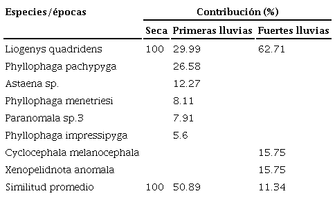 El análisis de similitud (Anosim) demostró que existen diferencias significativas de la estructura de la comunidad de escarabajos fitófagos entre las épocas de muestreo (R = 0.27, p = 0.002). Las épocas más disímiles corresponden a las primeras lluvias con la época seca en la RCM (tabla 3). La especie que más contribuyó a la abundancia en las épocas de muestreo fue Liogenys quadridens con mayores porcentajes en el primer y último mes de su aparición en las muestras recolectadas (tabla 4). Seguidamente, se encuentra Phyllophaga pachypyga , con la mayor contribución en junio, debido a las bajas proporciones con que se presentan el resto de las especies recolectadas en el mes.