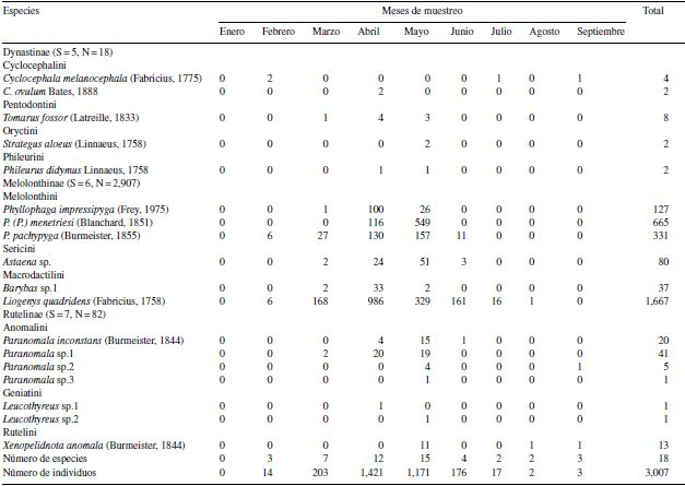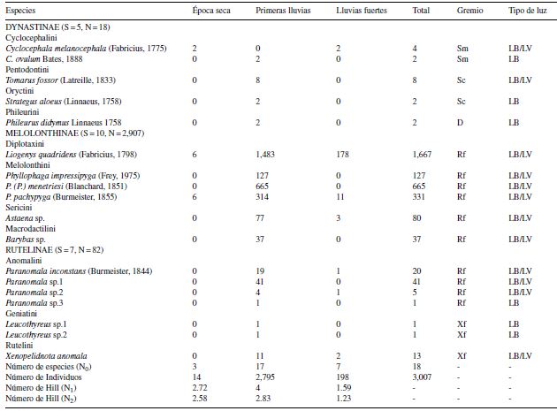 En marzo, el número de especies coincidió con el inicio de la época de primeras lluvias en la zona. En este muestreo se presentaron cambios fenológicos más evidentes en la vegetación, tales como aparición del follaje, lo que proporciona los primeros recursos utilizados por los adultos de la familia, quienes sincronizan sus ciclos de vida para garantizar su éxito reproductivo en la época de mayor disponibilidad de alimentos, tal como lo hacen otras especies y familias de coleópteros. Por el contrario, el resto de meses, es decir, los 3 últimos, se presentaron valores altos de precipitación y los valores de riqueza decrecieron, lo cual se debe a que la actividad de los escarabajos disminuye, aumenta su mortalidad y disminuye la efectividad de las trampas, tal como lo describieron Martínez et al. (2009) y Pinheiro, Diniz, Coelho y Bandeira (2002) en bosques de Brasil y Puerto Rico, respectivamente.