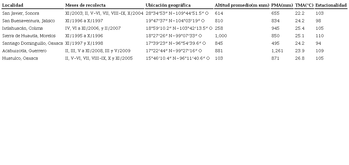 Los ejemplares de Cantharidae usados en este estudio fueron recolectados en 7 localidades ubicadas en el BTC, en la vertiente del Pacífico mexicano (fig. 1). Los muestreos entomológicos se llevaron a cabo en distintos años en cada localidad, entre 1995 y 2009, como parte de un proyecto a largo plazo que tenía por objetivo elaborar el inventario de la entomofauna del BTC y analizar sus patrones fenológicos (Linbos, 2014). Las localidades Santiago Dominguillo, sierra de Huautla y San Buenaventura fueron las primeras en ser visitadas y se muestrearon durante 12 meses. Las recolectas en otras localidades duraron entre 7 y 8 meses, debido a que se llevaron a cabo ajustes en función de la estacionalidad de los cantáridos. De cualquier forma, las recolectas en cada localidad fueron continuas e incluyeron las épocas de secas y de lluvias, y todas siguieron el mismo método de muestreo (tabla 1).