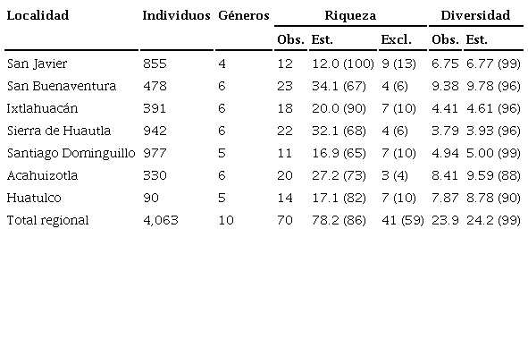 Los resultados del estimador no paramétrico ACE revelan que las recolectas efectuadas variaron entre el 65 y el 100% de la riqueza esperada. La riqueza de especies que se encontró en Santiago Dominguillo, San Buenaventura y sierra de Huautla correspondieron al 65, el 67 y el 68% de la riqueza de especies esperada, respectivamente; es decir, en estas localidades aún falta por registrar más del 30% de las especies. En San Javier, Sonora, se alcanzó el 100% de la riqueza esperada. Al integrar los datos de recolecta de todas las localidades y analizar la curva de acumulación de especies se encontró que los más de 4 mil registros corresponderían al 86% de la riqueza esperada, es decir, a escala regional faltaría por recolectar el 14% de las especies (tabla 3).
