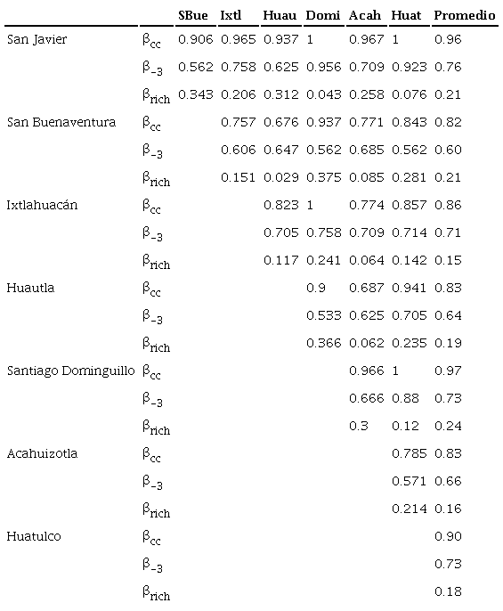 Para la diversidad beta, o βcc, se obtuvieron porcentajes menores al 34% de disimilitud (p. ej., entre sierra de Huautla y San Buenaventura). Los valores promedio de βcc fluctuaron entre 82% (San Buenaventura) y 97% (Santiago Dominguillo). La β-3 varió entre el 60% (San Buenaventura) y el 76% (San Javier); mientras que la βrich explica entre el 15% (Ixtlahuacán) y el 24% (Santiago Dominguillo) de la diversidad beta total (tabla 4). Los ensambles más similares en cuanto a composición de especies fueron San Buenaventura-Huautla y Huautla-Acahuizotla, y los más disímiles fueron San Javier-Santiago Dominguillo y Huatulco, Ixtlahuacán-Santiago Dominguillo y Santiago Dominguillo-Huatulco (tabla 4).