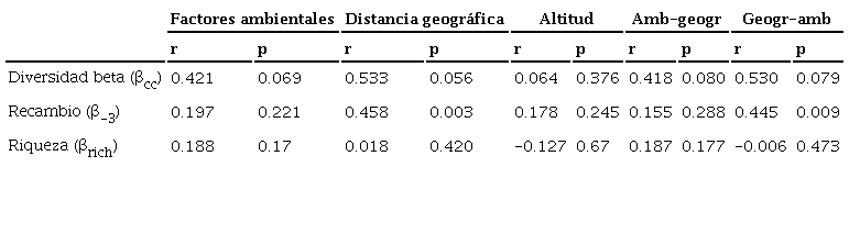 Las pruebas simples y parciales de Mantel dieron como resultado una correlación positiva y moderada entre la disimilitud debida al recambio de especies (β-3) y la distancia geográfica (r = 0.458; p < 0.01). La correlación se mantuvo, aun cuando se eliminó el efecto de los factores climáticos considerados (r = 0.445; p < 0.01) (tabla 5). El resto de las correlaciones no fueron significativas.