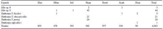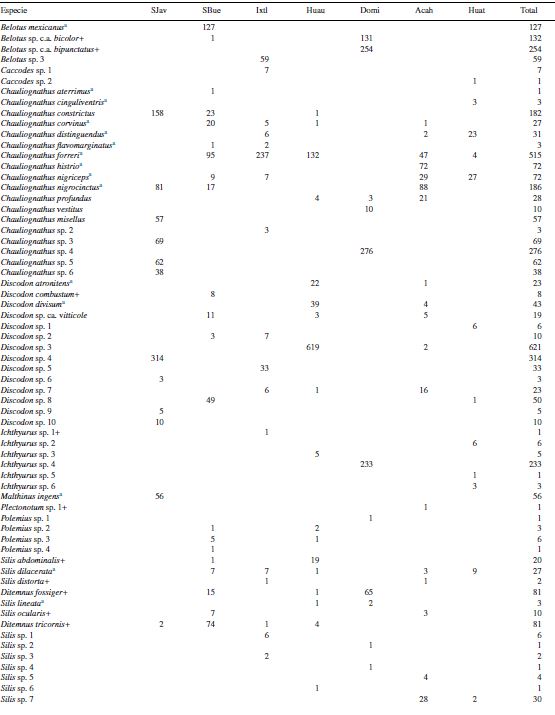 Se examinaron 4,063 ejemplares de Cantharidae, que se clasificaron en 10 géneros y 70 especies (tabla 2). Del total, 59% de las especies fueron exclusivas de la localidad en que fueron recolectadas (tabla 3) y ninguna se recolectó en todas las localidades; los porcentajes de exclusividad de especies para cada ensamble van del 15 al 75% (tabla 3). Dos de las 7 localidades estudiadas sobresalen por su riqueza de especies: San Buenaventura (23 especies) y sierra de Huautla 22 (tabla 3). En contraste, la mayor abundancia se encontró en Santiago Dominguillo (977 ejemplares, 24% del total), la localidad con menor riqueza de especies. La menor abundancia correspondió a Huatulco (90 ejemplares, 2.21% del total).