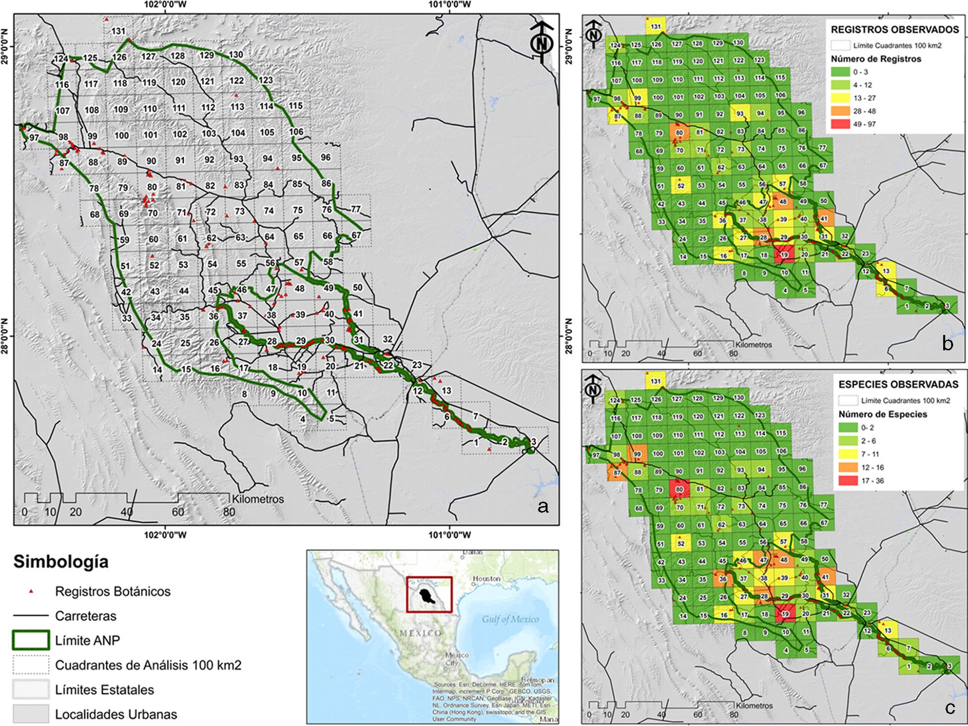 De las 91 especies documentadas, el número de registros osciló entre 1 y 72, con un promedio de 7 registros por especie. El taxón con mayor número de registros fue Vachellia rigidula (n = 72), seguida de Vachellia farnesiana (n = 62) y Senegalia greggii (n = 54). En contraparte, 24 especies solamente se documentan con 1 registro dentro del área de estudio, mientras que 10 especies presentaron solamente 2 registros (Celtis laevigata , Croton leucophyllus , Calliandra eriophylla , Senna wislizeni var. painteri , Zapoteca media , Koeberlinia spinosa , Krameria bicolor , Aloysia macrostachya , Lippia graveolens y Larrea tridentata ). En cuanto a los cuadrantes, se observó un total de 52 cuadrantes con al menos 1 registro, con un promedio de 13.09 y un rango entre 1 y 97 registros por cuadrante; por otro lado, 79 cuadrantes no cuentan con información botánica (fig. 1b). Respecto al número de especies por cuadrante, se observó un máximo de 36 (cuadrante 19), con un mínimo de 1 especie y un promedio de 6.84 especies por cuadrante. Geográficamente, la mayor proporción de registros y especies se presentó para la parte centro y sureste del área protegida (fig. 1c).