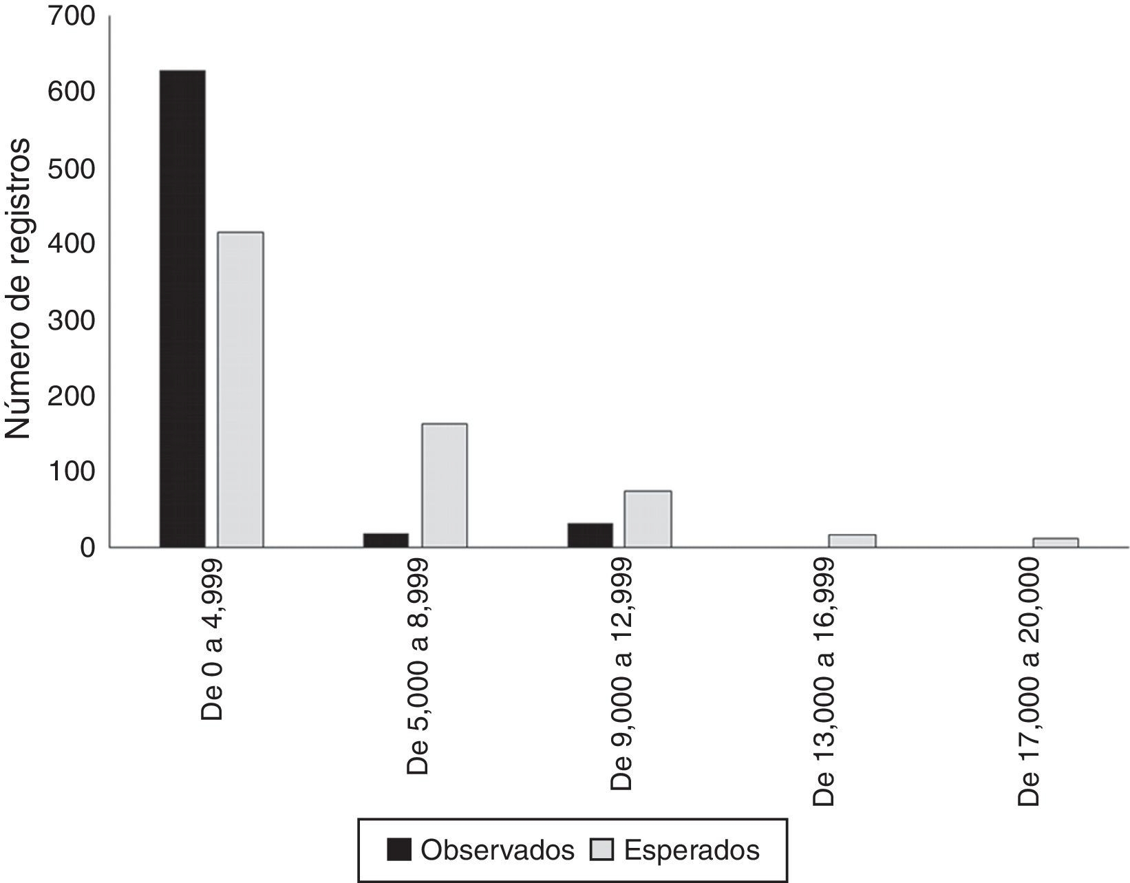 Las recolectas desarrolladas en el área presentaron diferencias significativas para todas las variables exploradas (temperatura media anual [Bio1]: U = 117,900; p < 0.01; isotermalidad [Bio3]: U = 189,650; p < 0.01; precipitación del mes más húmedo [Bio13]: U = 134,330; p < 0.01; estacionalidad de la precipitación [Bio15]: U = 175,720; p < 0.01; y la precipitación del trimestre más frío [Bio19]: U = 146,550; p < 0.01). Por otra parte, pese a que en el primer rango de distancia (de 0 a 4,999 m) se observó el mayor número de registros (n = 628), se presenta una diferencia significativa para todas las variables analizadas (tabla 5); es importante notar que para este rango el número de registros observados supera en 151% a los registros esperados aleatoriamente para este rango de distancia. Una situación similar se observa en el rango de 9,000 a 12,999 m, en que, pese a contar con 32 registros botánicos, solamente la variable de isotermalidad no fue diferente entre ambos conjuntos analizados (U = 1,091; p < 0.4581) (tabla 5). Para los rangos comprendidos por las distancias entre 5,000 y 8,999 y el de 13,000 a 16,999 m, la heterogeneidad ambiental es capturada por los registros previamente desarrollados, puesto que para todas las variables estudiadas no se presentaron diferencias significativas (tabla 5). Sin embargo, es importante señalar que los registros observados para estos 2 rangos apenas representan el 11% del esperado para estas distancias a carreteras. La clase de 17,000 a 20,000 m no fue comparada, dado que no hubo registros observados recolectados para esta zona.
