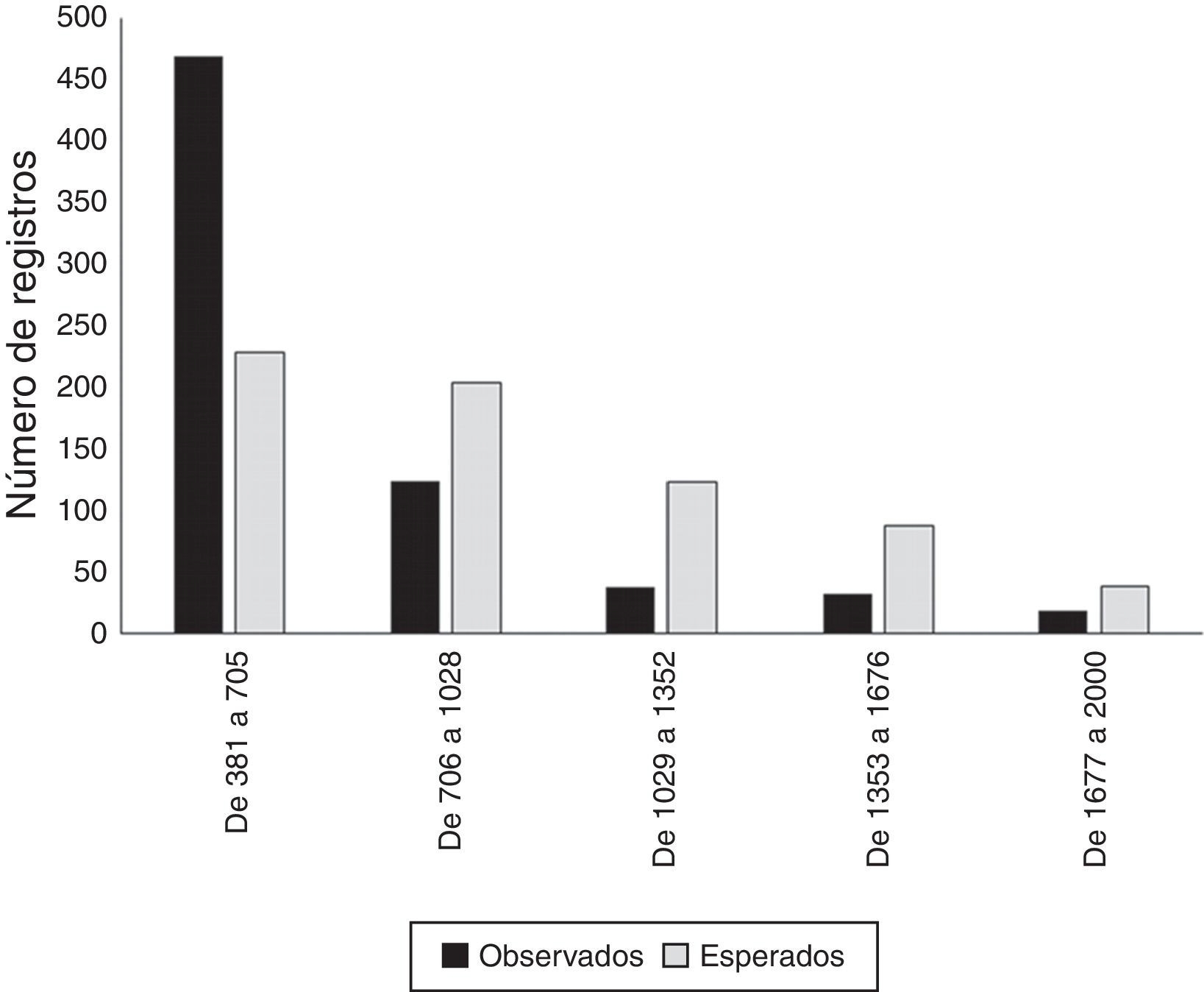 Cuando se considera la muestra total de registros, la heterogeneidad ambiental del área protegida se ve pobremente representada dentro del inventario botánico desarrollado, exhibiendo diferencias significativas para todas las variables entre los 2 conjuntos de datos analizados (observados contra aleatorios). Por otra parte, al analizar estas mismas variables considerando los distintos rangos de distancia a carreteras, se observa que para la primera comparación (rango de 0 a 4,999 m), solamente la isotermalidad (Bio13) fue representada de forma adecuada (U = 123,840; p < 0.1817). En contraparte, las variables restantes fueron significativamente diferentes (tabla 5). Es importante señalar que para este rango de distancia se determinó la mayor proporción de registros observados; sin embargo, el área proporcional comprendida por este rango ocupa el 40% de la superficie del área natural protegida (tabla 2), lo que le confiere la posibilidad de una mayor variabilidad ambiental para esta zona específica. Aunado a ello, y con un análisis más detallado de la distribución de los registros, puede señalarse que estos se encuentran agrupados hacia distancias entre los 1,000 y 2,000 m de las carreteras.