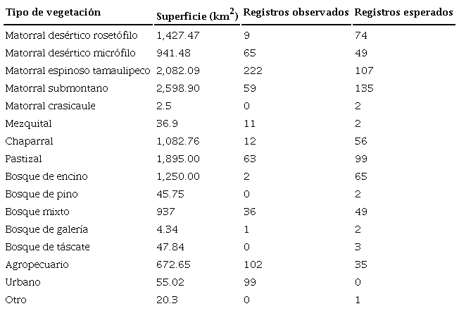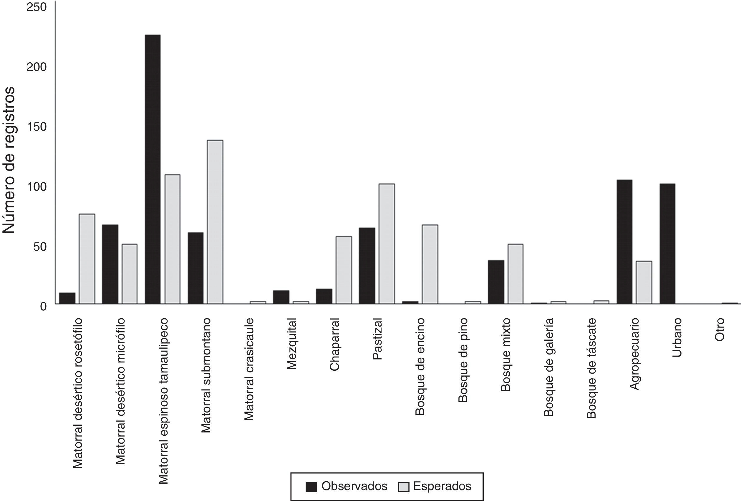 El mayor número de registros observados se presentó para el matorral espinoso tamaulipeco, el cual se encuentra sobrerrepresentado en un 207%, comparativamente con un diseño aleatorizado estratificado. De igual manera, las categorías de uso de suelo y vegetación del tipo agropecuario, matorral desértico micrófilo y mezquital fueron muestreadas con mayor intensidad a lo esperado (291.43; 132.65; 550.00%, respectivamente). Por otra parte, las restantes 12 categorías de vegetación resultaron subrepresentadas acorde con la cantidad de registros esperados mediante un muestreo aleatorizado estratificado (tabla 4; figs. 2b y 5). De esa forma, se observó una diferencia significativa entre los registros observados contra los esperados (χ 2 = 518.13; p < 0.01).