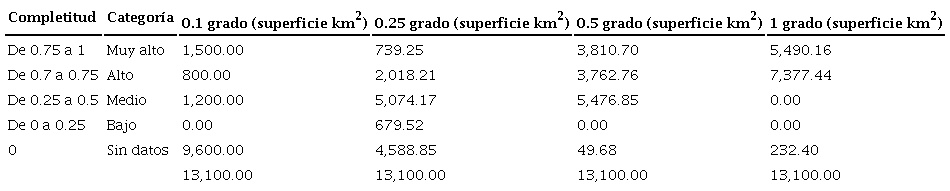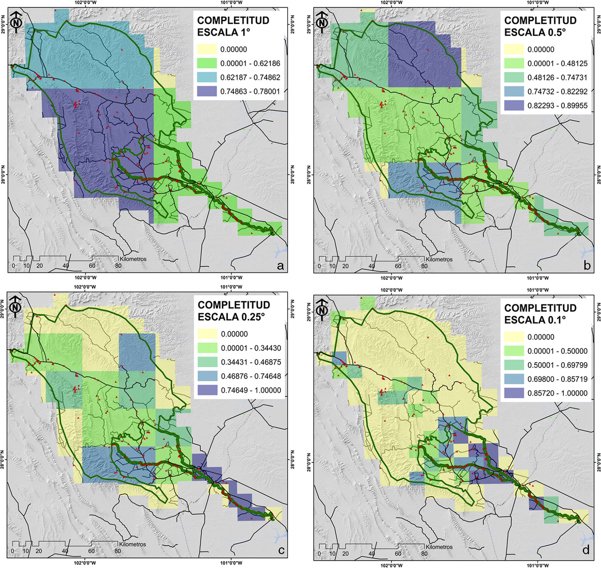Para el caso de las resoluciones espaciales más bajas (1y 0.5°) la mayor proporción de la superficie de la reserva (98 y 99% del ANP, respectivamente) presentan valores de completitud que van de medios a muy altos (rangos de completitud de 0.25 a 1) (tabla 6; figs. 6a y 6b). En contraparte, para el caso de las resoluciones más finas de un cuarto de grado (0.25°) y de 0.10° (100 km2) se observó una disminución de la superficies para estos rangos altos y muy altos de completitud del orden del 65 y 26% del ANP, respectivamente (tabla 6; figs. 6c y 6d).