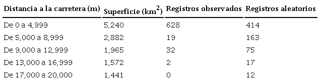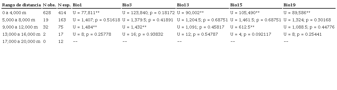 Asimismo, con el propósito de analizar el efecto del sesgo de distancia a carretera, sobre la descripción de las condiciones ambientales de las especies en el área, se agruparon los registros observados y aleatorizados, considerando los 5 rangos de distancia definidos (de 0 a 4,999 m; de 5,000 a 8,999 m, de 9,000 a 12,999 m, de 13,000 a 16,999 m y de 17,000 a 20,000 m). Se buscaron diferencias estadísticas para cada rango de distancia y para cada variable a través de la prueba de Mann-Whitney.