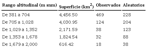 De igual forma, a partir de las curvas de nivel escala 1:250,000 (Conabio, 1998), se generó un modelo digital de elevación, del cual se definieron 5 rangos altitudinales (de 381 a 705 m snm, de 706 a 1,028 m snm, de 1,029 a 1,352 m snm, de 1,353 a 1,678 m snm y de 1,679 a 2,000 m snm), dentro de los cuales se virtieron los registros de plantas arbustivas del área (n = 681 registros), para luego describir el número de registros y especies contenidos para cada rango analizado. La matriz aleatoria de puntos, previamente generada (n = 681 registros), se comparó contra los registros y rangos altitudinales anteriormente descritos a través de una prueba de χ 2 (fig. 2b).