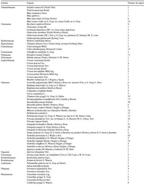 Para el análisis del nivel del inventario de plantas arbustivas, se recopilaron 681 registros, correspondientes a la información de 91 especies, 57 géneros y 27 familias (tabla 1), a partir de recolectas y observaciones de campo de los autores, en literatura especializada, así como de registros provenientes de bases de datos digitales de la Red Mundial de Información sobre Biodiversidad (REMIB, 2014) y el sitio de Global Biodiversity Information Facility (GBIF, 2014). Se utilizó el sistema taxonómico propuesto por The Angiosperm Phylogeny Group (2009) y para la revisión de las autoridades de las especies se utilizaron The Plant List (2010), The International Plant Names Index (2012) y el International Code of Botanical Nomenclature (Vienna Code, 2006). De la base de datos resultante se eliminaron los registros que presentaban inconsistencias geográficas (falta de claridad en la descripción de la localidad); de igual forma, se descartaron los registros que presentaron imprecisiones en la determinación taxonómica, como por ejemplo, la especie del género no determinada. Toda la información se administró para su despliegue dentro de sistemas de información geográfica. Se consideró como marco para la recopilación de los registros de estas especies el área comprendida por el polígono del Área Natural Protegida Río Sabinas, Coahuila (fig. 1).