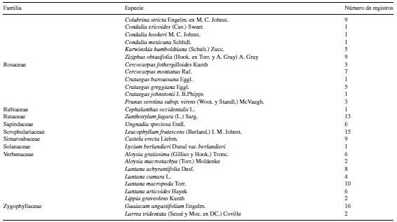 Para abordar esta cuestión, se evaluaron las recolectas botánicas del Área de Protección de Recursos Naturales Cuenca Alimentadora del Distrito Nacional de Riego 004 Don Martín (APRN CADDR 004), en lo respectivo a la porción río Sabinas, La Encantada, Santa Rosa y El Burro (Conanp, 2014), por ser una de las reservas más extensas dentro del noreste de México y revestir gran importancia para la conservación por distintos esquemas de regionalización establecidos (Arriaga et al., 2000; Benítez, Arizmendi y Márquez, 1999). Por otra parte, como grupo botánico para este análisis, se seleccionaron 91 especies de plantas arbustivas, por ser un conjunto representativo en términos de estructura y diversidad, dentro de los paisajes regionales del noreste mexicano (Canizales-Velázquez et al., 2009; González-Rodríguez, Ramírez-Lozano, Cantú-Silva, Gómez-Meza y Uvalle-Sauceda, 2010; Mora-Donjuán et al., 2013), y además, porque varias de sus especies constituyen un recurso fitogenético utilizado con frecuencia por las distintas comunidades humanas en la herbolaria tradicional, como elementos dendroenergéticos (obtención de leña y carbón), como forraje para el ganado, para la elaboración de artesanías, para la fabricación de muebles y herramientas, y como especies ornamentales (Estrada-Castillón, Yen-Méndez, Delgado-Salinas y Villarreal-Quintanilla, 2004; Ramos-Silva et al., 2007). Esta situación ha favorecido que este grupo se encuentre bien representado en las colecciones biológicas y los inventarios regionales del noreste de México (Estrada-Castillón et al. , 2004; Estrada-Castillón, Villarreal-Quintanilla y Jurado, 2005; Villarreal-Quintanilla, 2001).