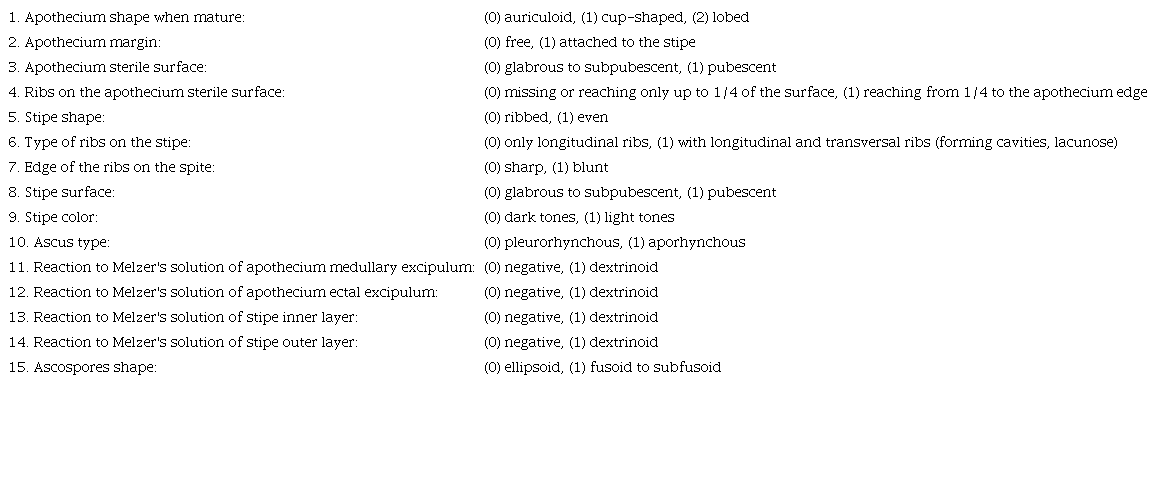 Eighteen type specimens and 91 additional ones from 16 herbaria: DAOM, ENCB, FCME, H, IBUG, K, MICH, NY, O, OSC, OULU, PRM, S, TAAM, UPS, and WTU, were studied. Herbaria abbreviations follow Thiers (2012). The material was studied according to the methodology described by Landeros, Iturriaga, and Guzmán-Dávalos (2012), that is to cut sections of the apothecia and stipes directly from the dry ascoma with a razor blade. Tissue sections were placed first in 96% ethyl alcohol and subsequently in water, Melzer's reagent, or cotton blue-lactophenol ( Largent, Johnson, & Watling, 1977). The terminology used here is that described by Landeros et al. (2012), except for the use of the dextrinoid term with Melzer's reagent, here abbreviated as Dx+, instead of hemiamyloid (rr+), which was incorrectly used by Landeros et al. (2012) because that term applies to the use of lugol, not Melzer's reagent ( Baral, 1987).