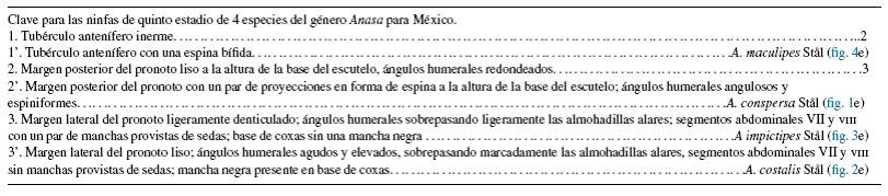 Se ofrece por primera vez una clave para la ninfas del quinto estadio de 4 especies de Anasa recolectadas en México; A. ruficornis no se incluye, ya que el quinto estadio no fue descrito por Brailovsky et al. (1998). Las ninfas se pueden separar por características morfológicas como los tubérculos anteníferos, los márgenes del pronoto y la forma de ángulos humerales.