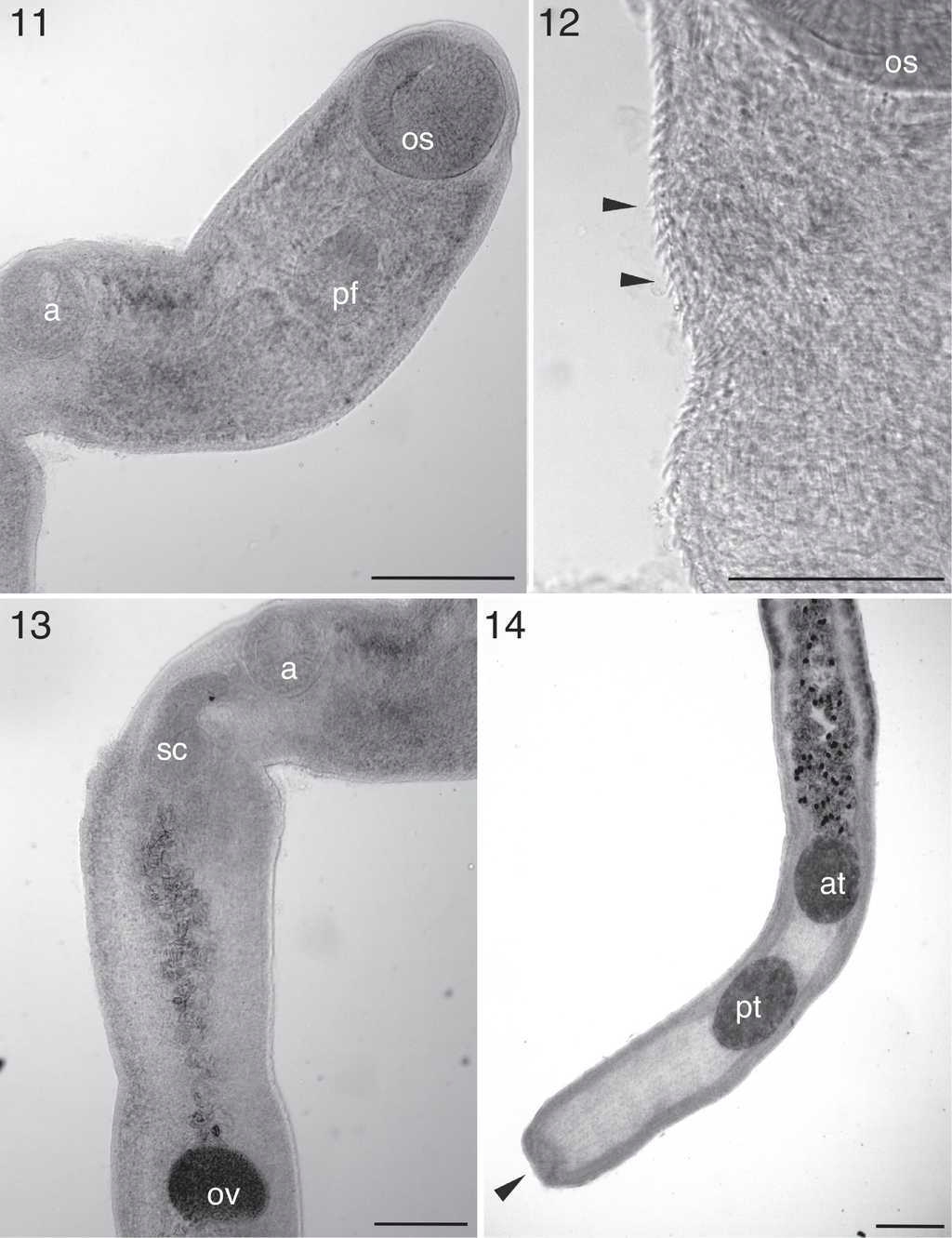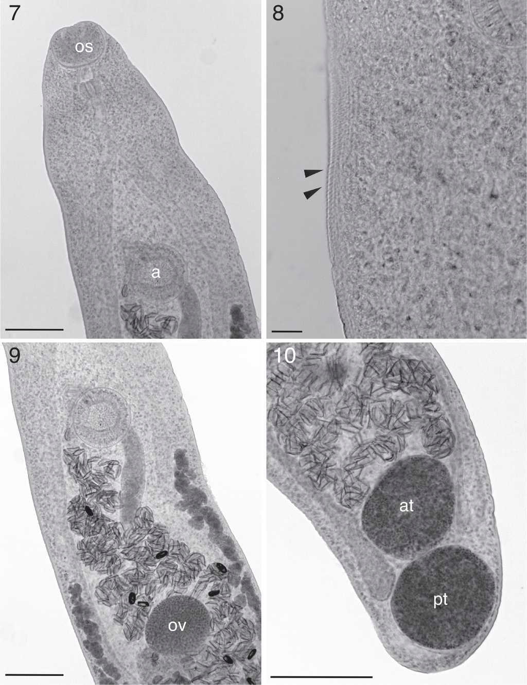 Concerning T. platensis in the present study, in the 6 specimens examined it was observed that intestinal caeca ended between the anterior and posterior testis (Fig. 10), never exceeding the testicular zone. This characteristic was not mentioned in the description T. platensis by Mañé-Garzón and Gil (1961b). The specimens collected in A. spixii, in the present study, harbored testis and ovaries approximately 2 times larger than the Uruguayan specimens.