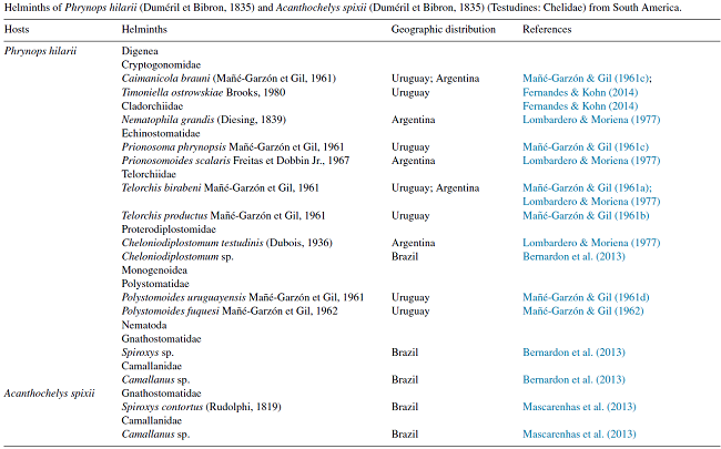 Regarding the knowledge of helminths of the 2 species there are some studies conducted in Uruguay, Argentina and Brazil (Table 1). The current study has the objective of reporting the presence of Digenea in the freshwater turtles, P. hilarii and A. spixii, and contributing to the knowledge of helminth parasite biodiversity in these hosts.