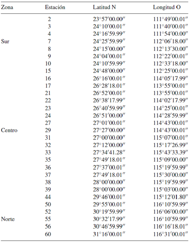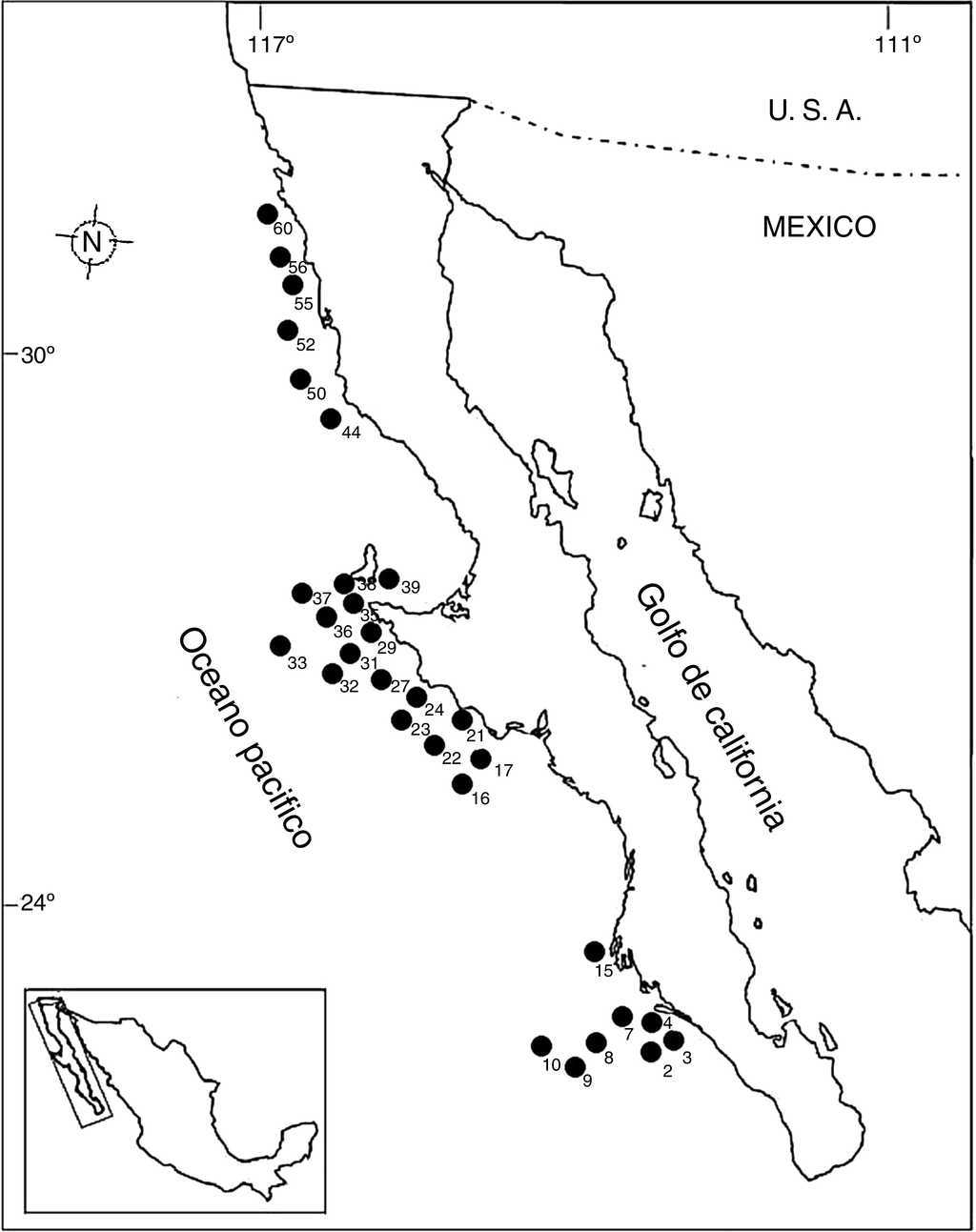 En octubre de 1995, dentro del marco del proyecto SIMSUP VIII «Sistemas Marinos de Surgencias y su relación con Pelágicos menores» realizado en la costa occidental de la península de Baja California a bordo del buque oceanográfico «El Puma», fueron recolectadas muestras de fondos blandos en 60 estaciones por medio de una draga Smith-McIntyre (0.1 m2). Las estaciones se dividieron en zona norte: desde punta Colonet hasta punta San Antonio; zona centro: desde punta Eugenia hasta San Hipólito, y zona sur: en la boca de bahía Magdalena (fig. 1). En la tabla 1 se muestran las coordenadas de las 30 estaciones positivas referentes en este trabajo. Cada transecto se dividió batimétricamente en 4 intervalos de profundidad: de 0-49 m, de 50-99 m, de 100-149 m y de 150-200 m, tal como ha sido sugerido por Hernández-Alcántara (2002); McConnaughey (1978) y Ross (1977). La cuantificación de organismos recolectados se llevó a cabo por especie y su registro en las tablas respectivas se presenta en términos de densidad (orgs/0.1 m2), que es el área de muestreo de la draga Smith-McIntyre utilizada en la toma de muestras. La representación y análisis de la distribución espacial de la densidad y el número de especies se realizó por medio de mapas de distribución. Para esto, se incluyeron diversos índices y tratamientos estadísticos tales como: diversidad alfa, equitatividad de Pielou y dominancia de Simpson. Con la finalidad de analizar las variaciones norte-sur de la fauna de poliquetos y comparar las diferencias en la composición de especies a lo largo del margen peninsular, se evaluó la diversidad Beta (Gray, 2000). La utilización de la diversidad Beta en la costa occidental de la península de Baja California permitió detectar cambios bióticos en sentido norte-sur, por medio del índice propuesto por Wilson y Shmida (1984). Para seleccionar adecuadamente las especies representativas de una comunidad se determinaron las especies dominantes tanto en las localidades de muestreo como en las diferentes regiones geográficas mediante la dominancia específica.