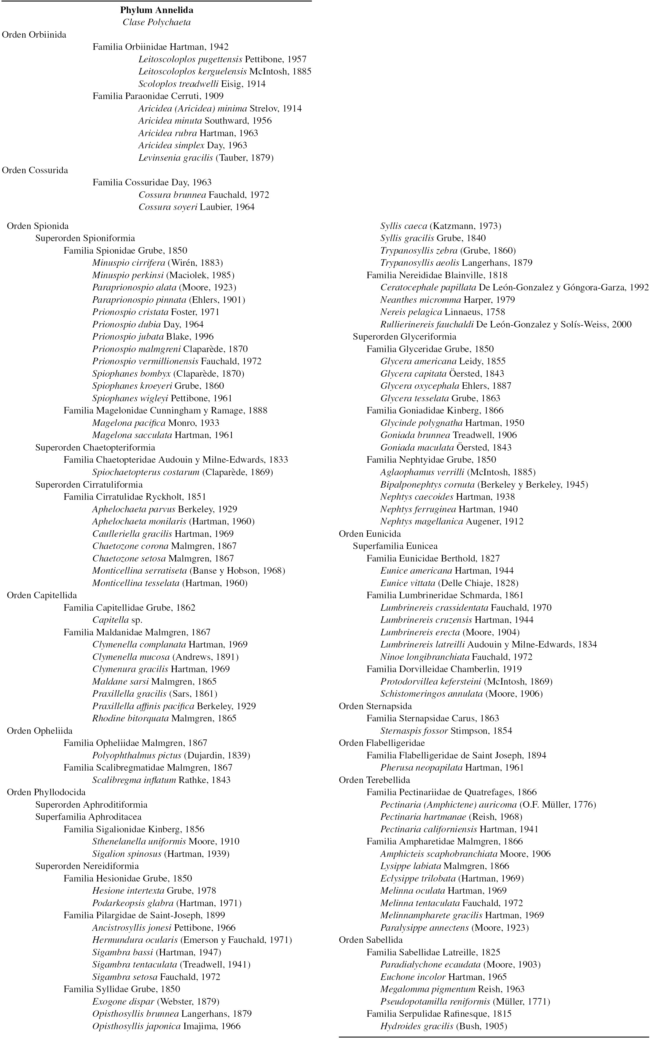 La costa occidental de Baja California hasta mediados de 1980 concentraba aproximadamente 236 especies de poliquetos (Salazar-Vallejo, de León-González y Salaices-Polanco, 1989). Barbosa-López (2008) llevó a cabo la revisión de las bases de datos de los registros realizados entre 1901 y 2004 en la plataforma continental de la costa occidental de Baja California, registrando un total de 491 especies, por lo que el listado elaborado en el presente estudio corresponde al 20.2% de tales especies (Anexo 1). En estudios de ciclos cortos, Rodríguez-Valencia (1994) identificó un total de 20 familias en el área correspondiente a bahía de San Juanico, en la costa occidental de Baja California Sur, de las cuales el 85% de ellas son las mismas a las encontradas en el presente trabajo. Asimismo, Hernández-Guevara (1994) identificó 23 familias de poliquetos en la bahía Sebastián Vizcaíno, donde el 88% también están presentes en esta investigación. Con el trabajo de De León-González (1994a) se obtuvo un traslape del 85% de las familias documentadas en ambos estudios.