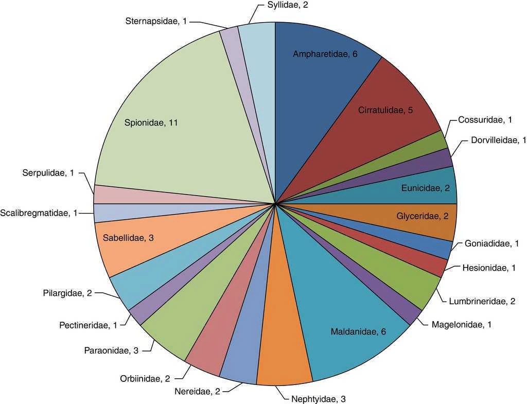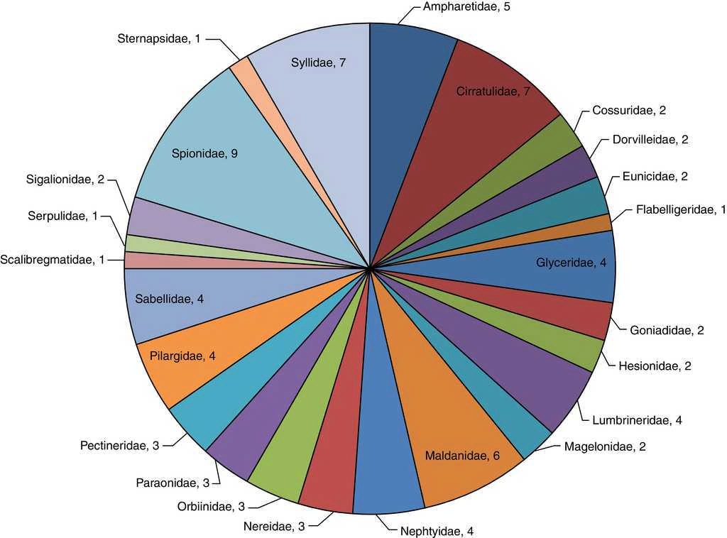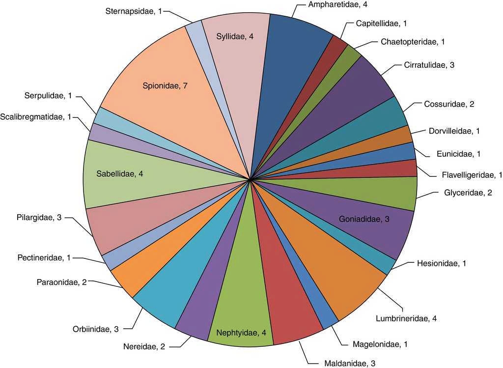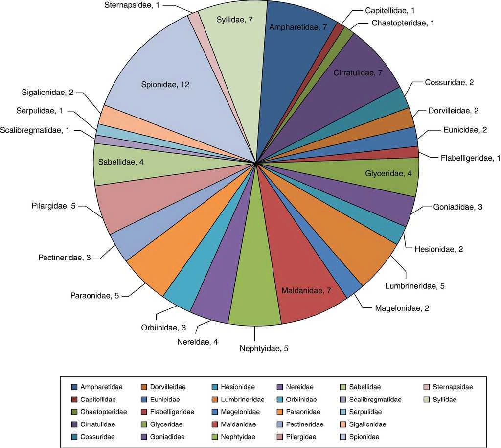 El 64.5% de las especies de poliquetos identificadas en el presente estudio pertenecen a 10 familias: Spionidae, Maldanidae, Ampharetidae, Syllidae, Cirratulidae, Nephtyidae, Paraonidae, Pilargiidae, Lumbrineridae y Nereididae, las cuales, en su mayoría, son dominantes en sustratos blandos. Rodríguez-Valencia (1994) obtiene una estimación del 62.2% en las 10 familias con mayor riqueza, donde 7 de ellas aparecen en ambos listados, y Hernández-Guevara (1994) obtiene el 67.3% con 5 familias muestreadas en ambos trabajos. En la misma área de estudio, Barbosa-López (2008) registra que Spionidae, Paraonidae, Ampharetidae, Cirratulidae, Nereidae y Syllidae contribuyen con el 32.8% de las especies. Hernández-Alcántara (2002), en el golfo de California, también señala dentro de las primeras 10 familias con la mayor riqueza y número de organismos a Spionidae, Lumbrineridae, Nereididae, Paraonidae y Cirratulidae, mismas que representan el 27.6% de las especies.