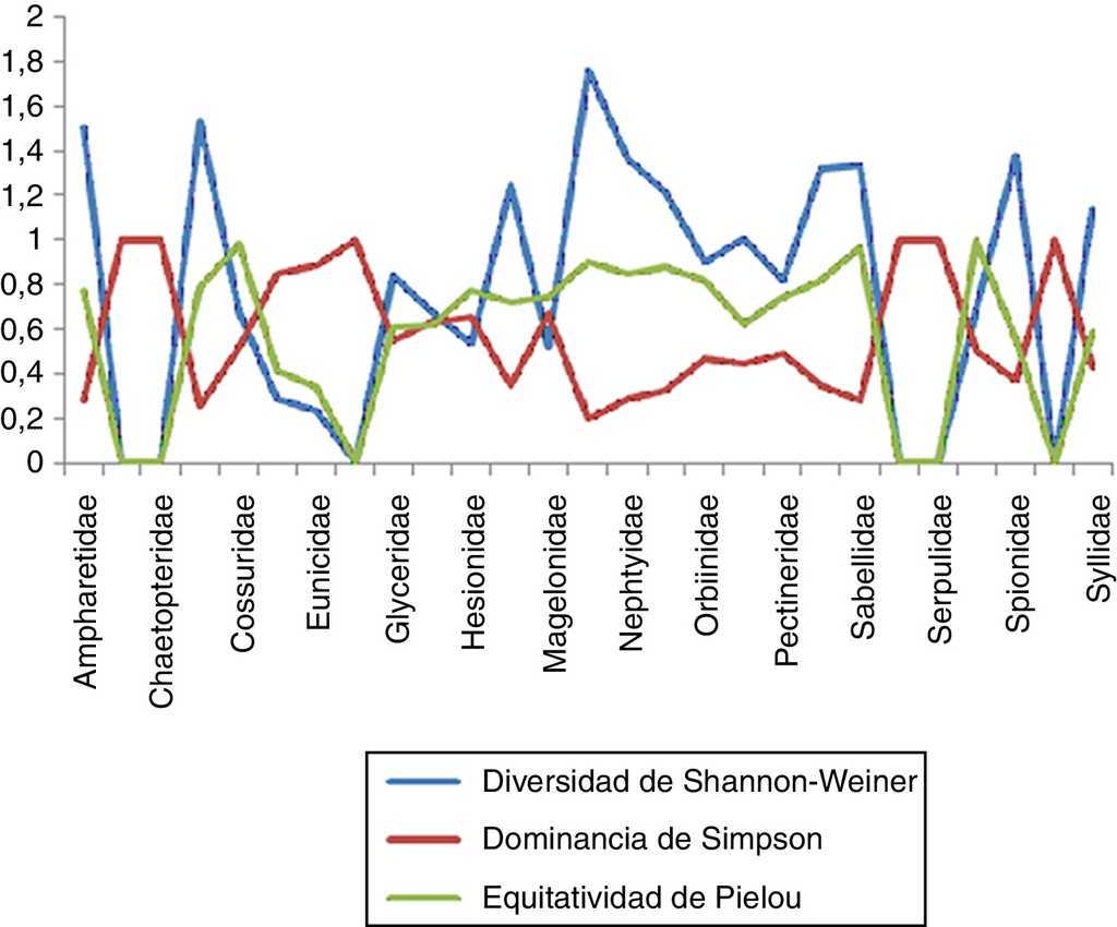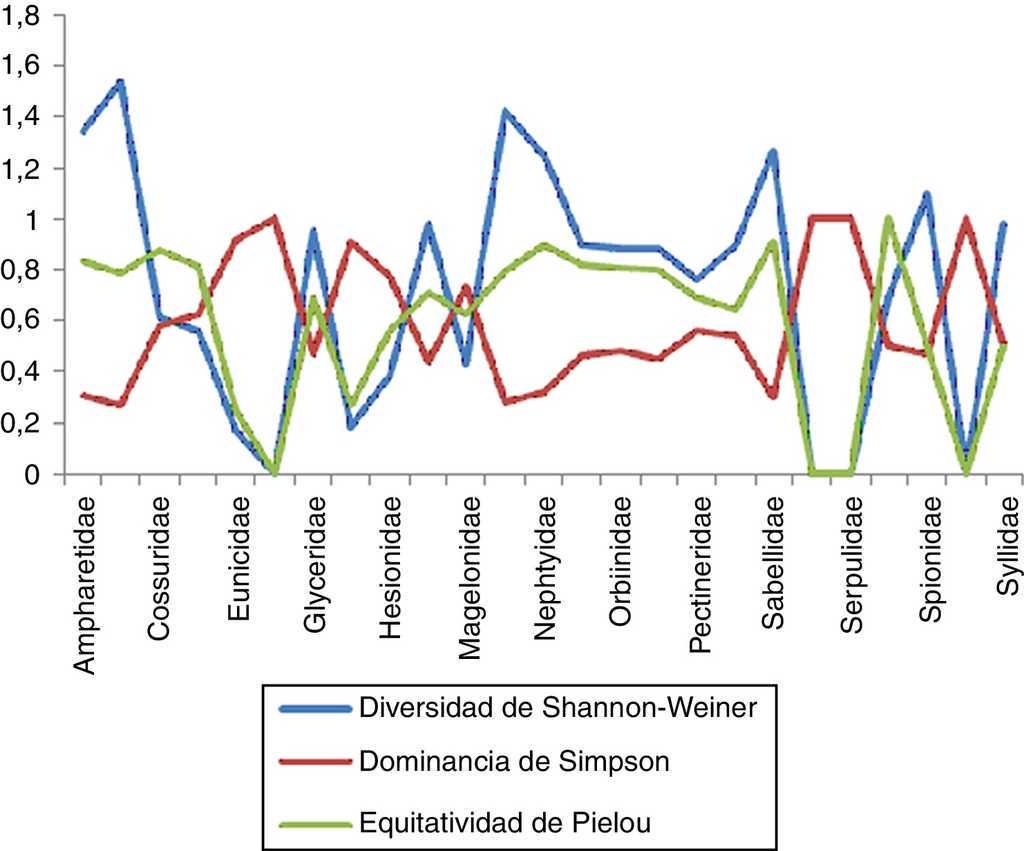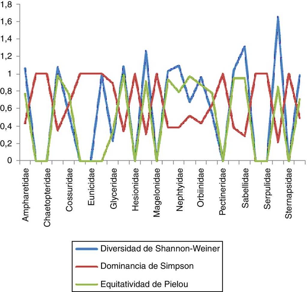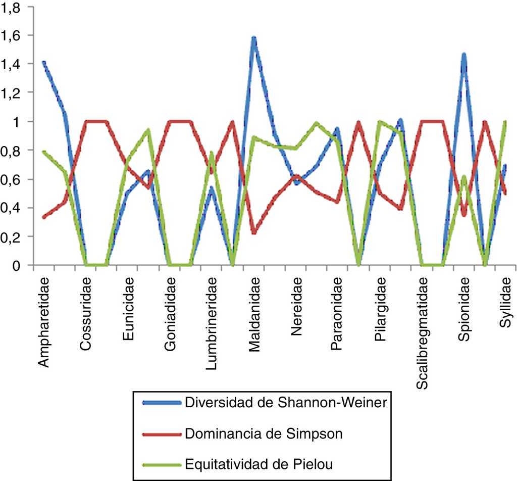 Los resultados indican que la familia Maldanidae presentó la mayor diversidad de Shannon-Wiener con un valor de 1.76, mismo que contrasta con la obtención de un dato bajo de dominancia (0.194) y corroborado por un alto valor de equitatividad correspondiente a 0.9032. Otras familias donde también se observan datos sobresalientes de diversidad y equitatividad son Cirratulidae, Spionidae, Nephtyidae y Sabellidae. De la misma forma, las familias con valores bajos de diversidad y equitatividad, así como una alta dominancia son Dorvilleidae y Eunicidae, tal como se observa en la (fig. 6).