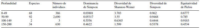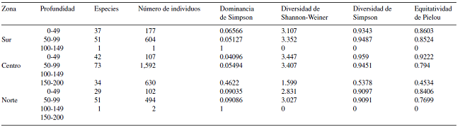 De las 60 estaciones de muestreo durante el crucero SIMSUP VIII, en 30 se obtuvo por lo menos un ejemplar de poliqueto, donde el 53.3% corresponden a la zona centro, el 26.7% a la sur y el 20% a la norte. Asimismo, la mayor riqueza (85.9%) y abundancia (62.8%) fueron producto de recolectas realizadas en la zona centro. Cabe señalar que estas diferencias con respecto a las otras 2 zonas podrían atribuirse a que el 56% de las estaciones muestreadas fueron en esta área. En el estudio realizado por Rodríguez-Valencia (1994), equivalente a la zona centro y comparado con el de Hernández-Guevara (1994), correspondiente a la zona norte, también fue superior en riqueza específica y abundancia, tal como sucedió en el presente estudio (tabla 2). Batimétricamente, el intervalo 50-99 m para el área total y para las 3 zonas presentó la mayor riqueza y abundancia específica (tabla 3), así como la mayor diversidad estimada con base en el índice Shannon-Wiener y Simpson.