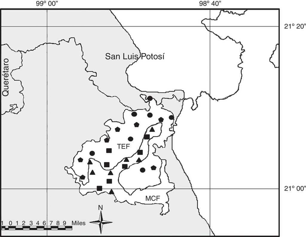 Tropical evergreen forest is distributed in the northern portion of Hidalgo state (Villavicencio-Nieto & Pérez-Escandón, 2005), near the border with San Luis Potosí (Rzedowski, 2006). Puig (1991) referred to this as semi-deciduous tropical forest; however, Rzedowski (2006) grouped this vegetation type within tropical evergreen forest, because tropical evergreen forest and semi-deciduous tropical forest share similar structural elements. In our study area, this vegetation was characterized by trees over 20 m in height and a rich diversity of woody climbing plants, orchids, and bromeliads (Puig, 1991). In this type of vegetation, the patterns of abundance of tree species makes it difficult to determine the dominant tree species; however, the canopy is mainly composed by trees of the genera Brosimum, Bursera, Ceiba, Coccoloba, Ficus, and Dendropanax (Puig, 1991).