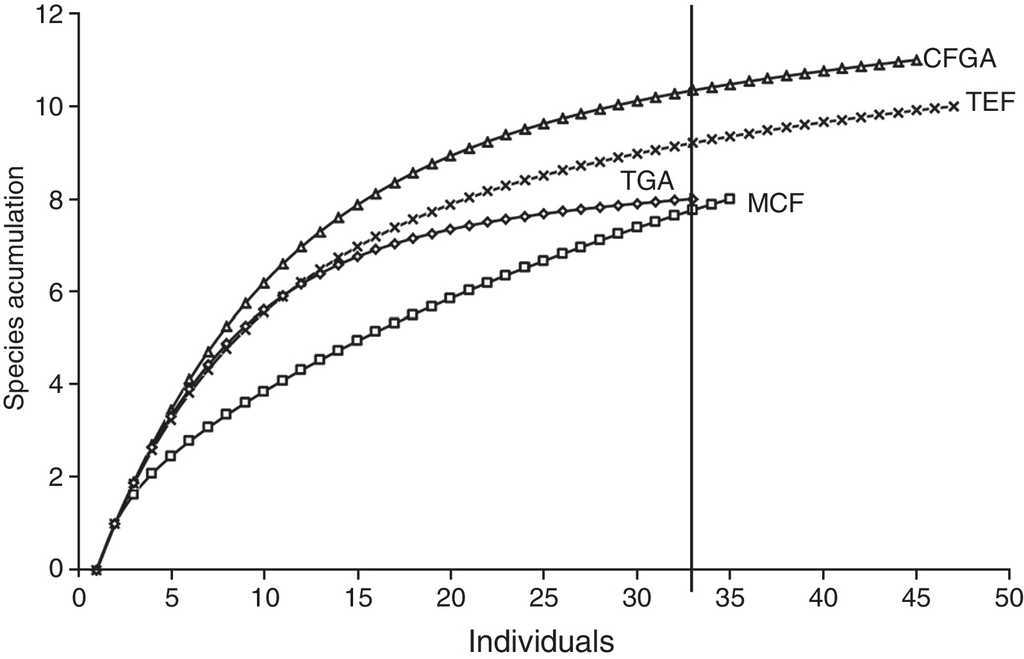 In assessing species richness considering the same number of individuals, we observed that the most diverse community is the CFGA. The result for MCF, however, should be taken with caution because for this vegetation type we did not observe that the curve reached an asymptote (Fig. 2); in addition, the inventory completeness was below 80%.