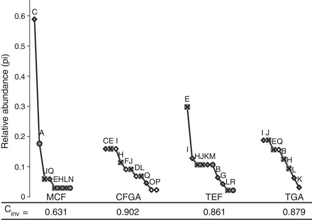 In order to calculate alpha diversity, we used the diversity index of Hill's numbers first order (1D; Jost, 2006; Moreno et al., 2011), which is based on the effective number of species and considers the relative abundance of the species in the community by using the Shannon exponential index expressed by the formula 1D = exp(H’).