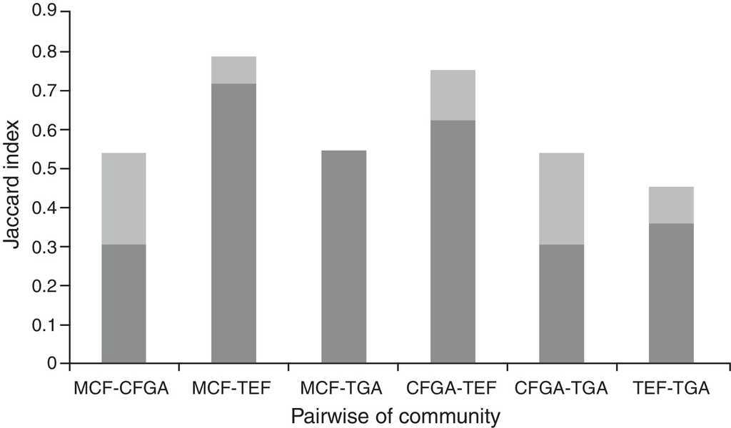 The most dissimilar species composition occurred between the preserved forests MCF-TEF, whereas the least dissimilar composition was between the communities of TEF-TGA (Fig. 4). The higher replacement was observed within communities of MCF-TGA that showed 100% of the beta diversity, whereas within communities corresponding to the sets of MCF-CFGA and TGA-CFGA the lowest percentage richness difference (42.85%) was exhibited.