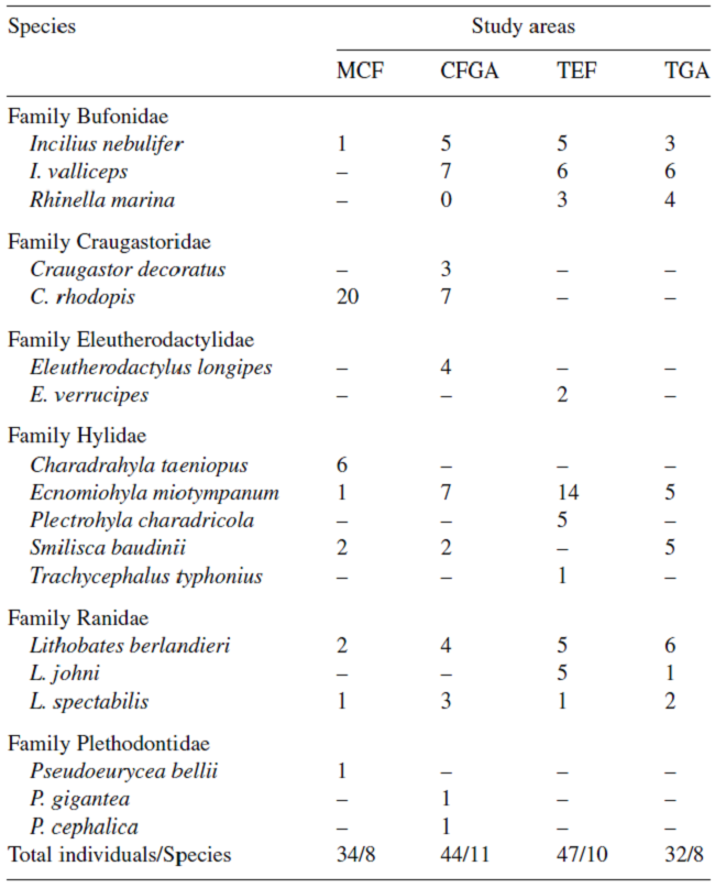 In this study, we recorded 157 individuals of amphibians belonging to 18 species included in 11 genera, 6 families, and 2 orders (Anura and Caudata; Table 1). Higher species richness was recorded in CFGA (11 species) with a completeness inventory of 100%, whereas the lowest richness was obtained in the TGA (100%) and the MCF (80.4%), with 8 species each (Table 2).