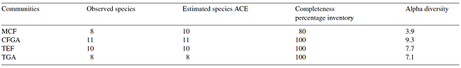 Species accumulation curves were performed using the program EstimateS V 9.1 (Colwell, 2005), in order to assess species richness of TEF, MCF, TGA, and CFGA, and to determine whether the completeness of the inventory allowed comparisons among them (Carbajal-Cogollo & Urbina-Cardona, 2008). Completeness of the inventory was assessed with the nonparametric estimator ACE. This estimator divides species into 2 categories: abundant, when a sample has more than 10 individuals recorded; and rare, when a sample contains 10 or fewer individuals. The ACE estimator is based on the proportion of rare species in the sample (singletons) to determine the missing species in the community, so abundant species do not provide information about the missing species (Chao & Shen, 2003).