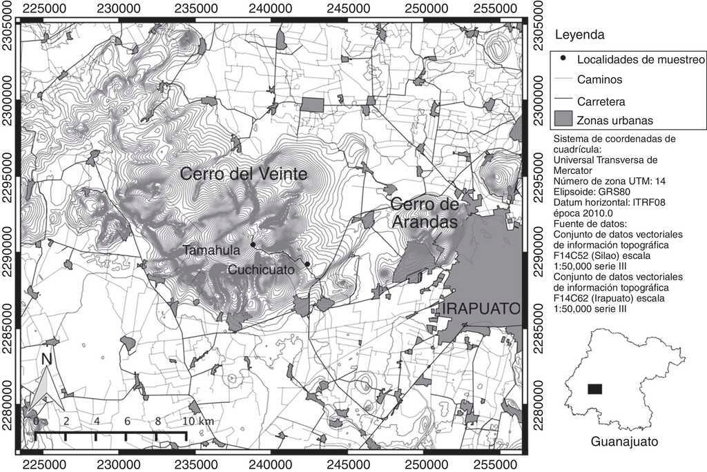 El cerro del Veinte se encuentra localizado en la región del Bajío, en el centro del estado de Guanajuato, y comprende una superficie aproximada de 6,120.52 ha (fig. 1). La elevación oscila entre los 1,770 y 2,340 m snm, el tipo de clima es semicálido-subhúmedo con un régimen de lluvias en verano, conforme a la clasificación climática de Köppen, modificada por García (1973). El tipo de vegetación característico en el sitio corresponde a la selva baja caducifolia (Rzedowski, 1978; Rzedowski y Calderón de Rzedowski, 1987). La temperatura media anual oscila entre 16 y 28 °C, siendo el mes más cálido mayo, con una temperatura promedio de 28 °C, y el más frío enero, con una temperatura promedio de 16 °C. La precipitación media anual es de 700 mm, siendo el mes más lluvioso agosto, con un valor promedio anual de 1,700 mm, y el mes con menor precipitación, febrero, con 300 mm (García, 1973).