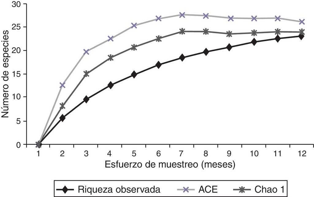 Se realizó una curva de acumulación de especies a partir de los registros obtenidos en campo para determinar la representatividad del inventario herpetofaunístico (Halffter, Moreno y Pineda, 2001; Moreno, 2001; Moreno y Halffter, 2000). Se emplearon los estimadores no paramétricos Chao 1 y ACE, debido a que estos se basan en la abundancia de individuos de cada especie de una muestra representativa (Halffter et al., 2001; Moreno y Halffter, 2000). Las estimaciones fueron realizadas con el programa EstimateS Versión 7.5.0 (Colwell, 2006).