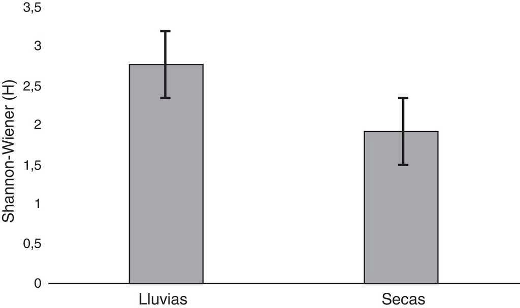 El estimador Chao 1 predijo 24 especies —con un 85% de la completitud— y ACE, 27 especies —con una completitud del 96%—, en tanto que la observada fue de 23 especies (fig. 2). La diversidad calculada para el índice de Shannon-Wiener arrojó un valor de H’ = 2.7 para lluvias y de H’ = 1.9 en secas, siendo estadísticamente significativa la diferencia entre estaciones (U Mann-Whitney, U = 1.2 ± 1.6, P = 0.0018; fig. 3).