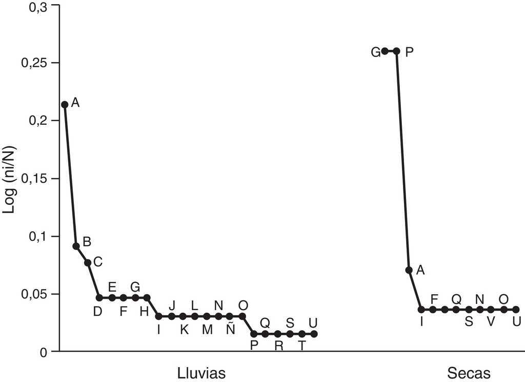Las curvas de rango-abundancia o de Whittaker mostraron que la rana Hyla eximia fue la especie de anfibio más abundante en lluvias y Anaxyrus compactilis en secas. Para los reptiles, la lagartija Sceloporus torquatus y la tortuga Kinosternon integrum fueron abundantes en lluvias, y para secas las lagartijas S. spinosus y Aspidoscelis gularis. En serpientes tanto para la temporada de lluvias como en secas su abundancia fue baja (fig. 4).