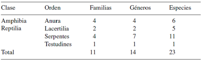 En este trabajo se registraron 23 especies de herpetozoos —6 anfibios y 17 reptiles—. Los anfibios estuvieron representados por los anuros con 6 especies, siendo la familia Hylidae la de mayor diversidad con 3 especies. Para los reptiles, el orden con mayor número de especies fue el de las serpientes con 11, seguido de los lacertilios con 5, y las tortugas con una sola especie (tabla 1). En cuanto a la riqueza por estación en la temporada de lluvias se presentaron 22 especies —6 de anfibios y 16 de reptiles— y en secas, 12 —una de anfibio y 11 de reptiles; tabla 2—.