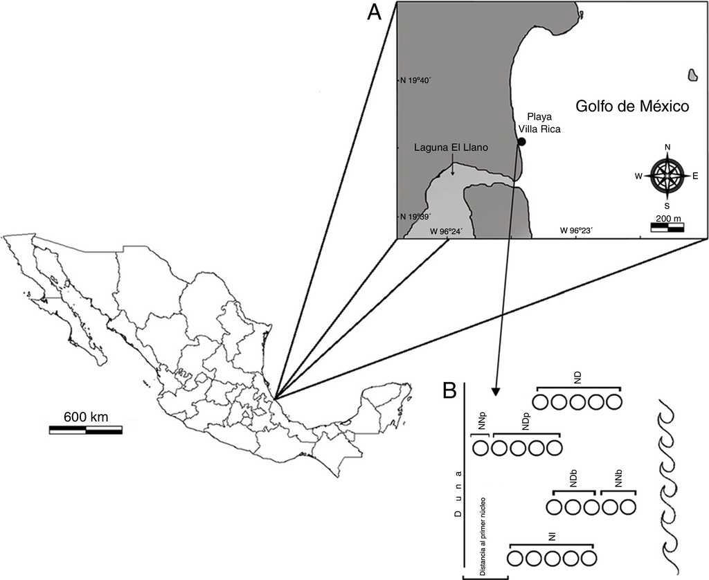 La playa Villa Rica se encuentra localizada en el municipio de Actopan, Veracruz, entre las coordenadas 19°40’18” N y 96°23’42” O (fig. 1A). Es una playa arenosa disipativa, relativamente estrecha (40-70 m), el ancho es mayor de 54 m durante la marea baja (Vidal, Losada, Medina y Losada, 1995). La berma es extensa y la zona de rompiente se presenta a mayor distancia de la costa; en época de nortes se observa una ligera erosión, el resto de esta zona siempre es estable. Presenta forma cóncava y asimétrica hasta la boca de la laguna El Llano, y luego recta hasta llegar a la playa El Farallón. Está caracterizada por un trazo recto de 4 km y una orientación noroeste-sureste. El tipo de marea es mixta, predominantemente diurna y de poca amplitud (0.5-0.7 m) (Geissert, 1999). La zona supralitoral está delimitada por asentamientos humanos, en la porción inferior se encuentran parches pequeños del bejuco de playa (Ipomoea sp.) y en la zona mesolitoral el representante más conspicuo es el cangrejo fantasma (Ocypode quadrata).