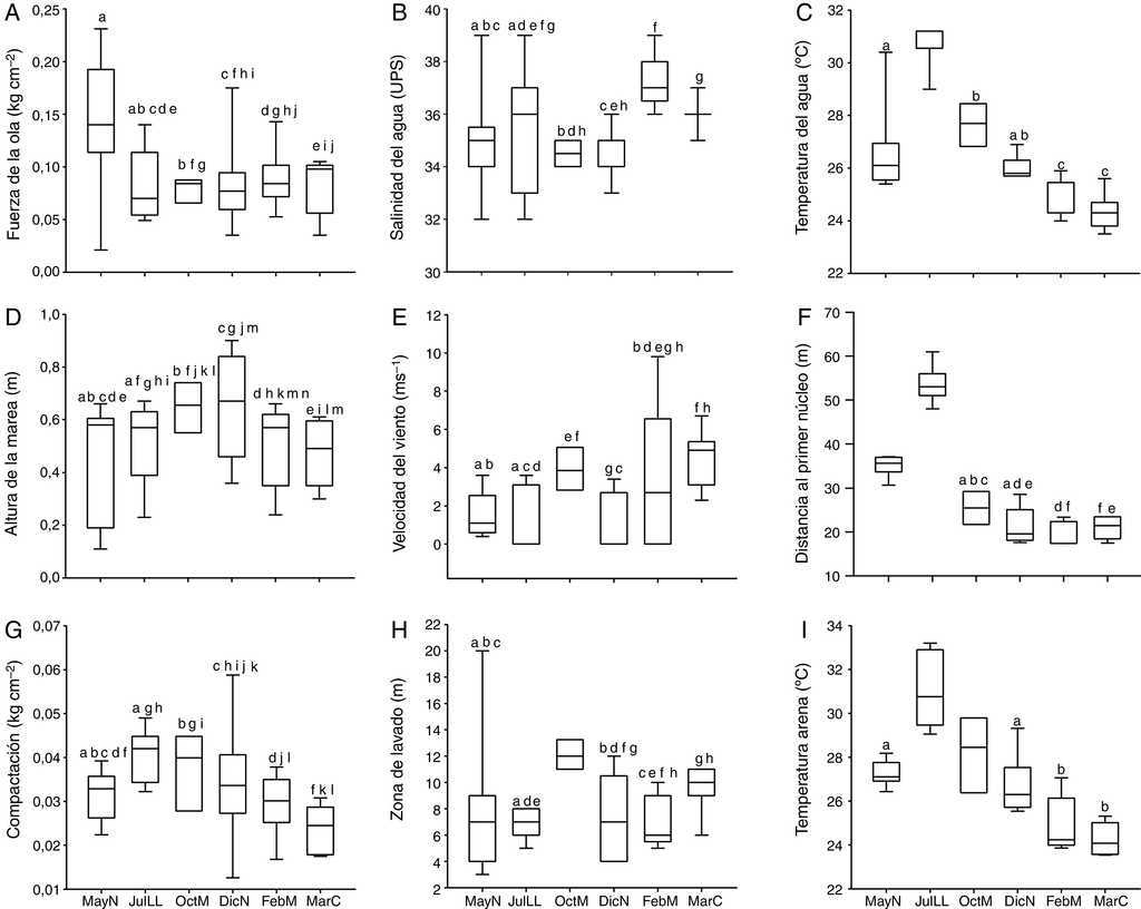 Las características físicas de la playa Villa Rica durante el tiempo de la investigación fueron las siguientes: el tamaño predominante de grano fue < 0.5 mm, que corresponde a arenas medianas, con 0.34 ± 0.15% de materia orgánica. La pendiente osciló de 0.03 a 0.1 grados, lo cual define la playa como casi plana. Las variaciones del resto de los parámetros ambientales se presentan en la figura 2, se indican las diferencias significativas —prueba de Kolmogorov-Smirnov; α = 0.05— entre cada fase lunar. La comparación de los datos ambientales en los periodos de horas luz y oscuridad no mostraron diferencias significativas en ninguna de las fases lunares (prueba de Kolmogorov-Smirnov; p = 0.05).