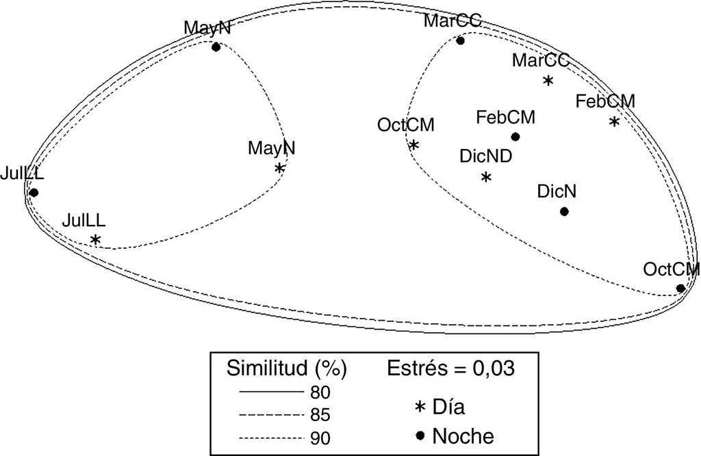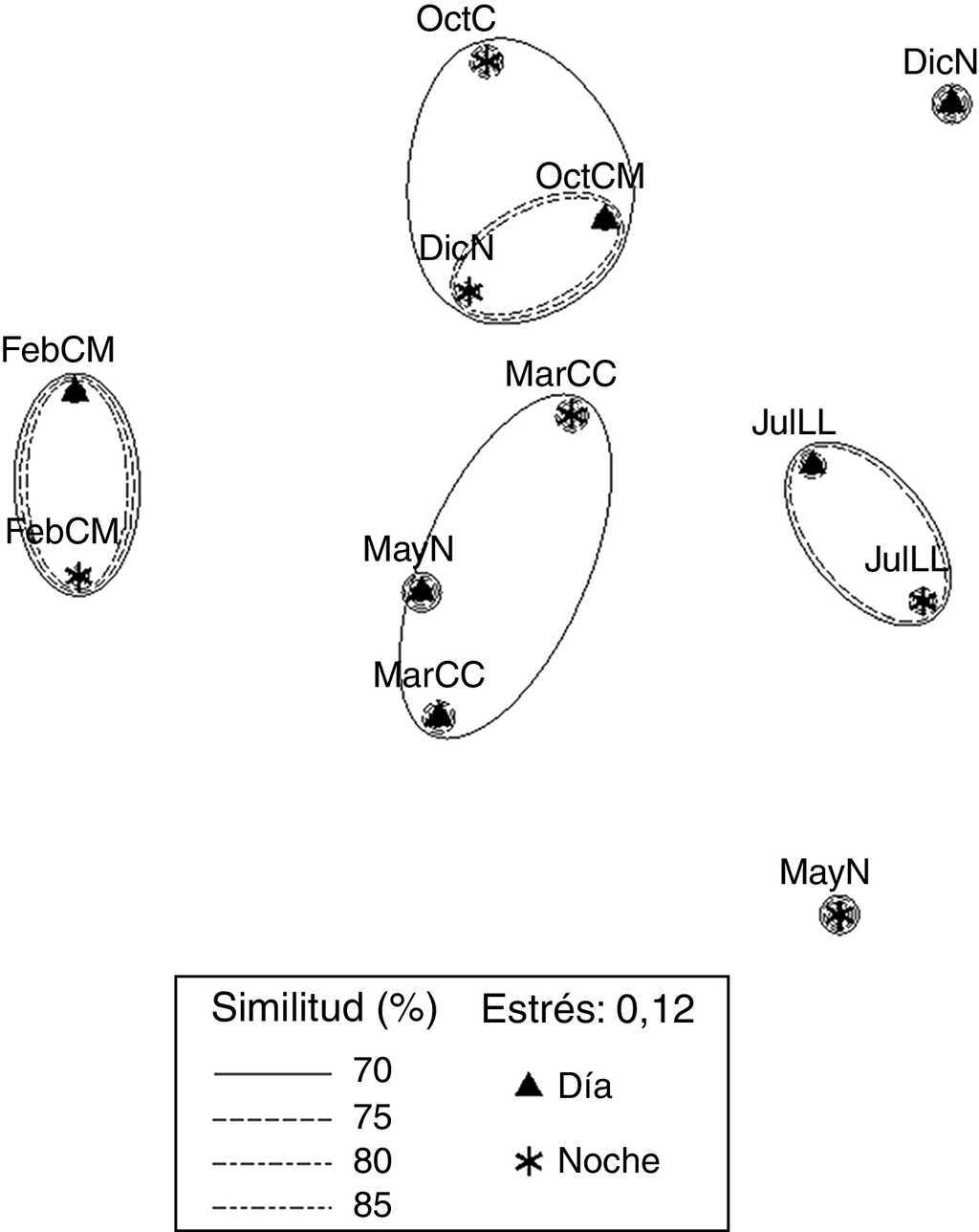 El plot del EMNM de datos biológicos arrojó un valor de estrés de 0.12, que corresponde a una ordenación buena. Se diferenciaron 4 grupos (fig. 5). El grupo 1 se conformó con valores de similitud de 70% a 80%, FebMD y FebMN, en el que se registraron los valores más bajos de diversidad (1.07 y 1.09 bits org-1) y dominancia (0.47 y 0.43), comparten 2 especies (Excirolana sp. y Excirolana braziliensis). El grupo 2 lo conformaron OctMD, OctMN y DicNN, con un valor de similitud de 70%; en este grupo se registraron los valores mayores de riqueza de especies (5), valores de densidad altos (4,715; 2,967 y 2,543 org m-2) y valores de diversidad intermedios (1.65; 1.28 y 1.74 bits org-1) y dominancia (0.62; 0.48 y 0.67), comparten 3 especies (Emerita benedicti, Excirolana sp. y Excirolana braziliensis). El grupo 3 lo conformaron MarCD y MarCN, con un valor de similitud de 70%, en este grupo se registraron valores de riqueza de especies (4-5), diversidad (1.79-1.82 bits org-1) y dominancia altos (0.68-0. 76), comparten 4 especies (Emerita benedicti, Excirolana sp., Excirolana braziliensis y Pseudohaustorius sp.). El grupo 4 lo conformaron JulLLD y JulLLN, con valores de similitud de 70% a 75%, en el que se registraron los valores más altos de riqueza de especies (5), diversidad (1.72-2.11 bits org-1) y dominancia (0.63-0.74), valores bajos de densidad (1,084-1,456 org m-2), además de compartir 5 especies (Emerita benedicti, Excirolana sp., Excirolana braziliensis, Pseudohaustorius sp. y Albunea paretii). En MayNN se registraron los valores más bajos de riqueza de especies (3) y densidad (344 org m-2). En MayND se registró un valor alto de diversidad (1.6 bits org-1), intermedio de riqueza de especies (4) y bajo de densidad (1,429 org m-2).