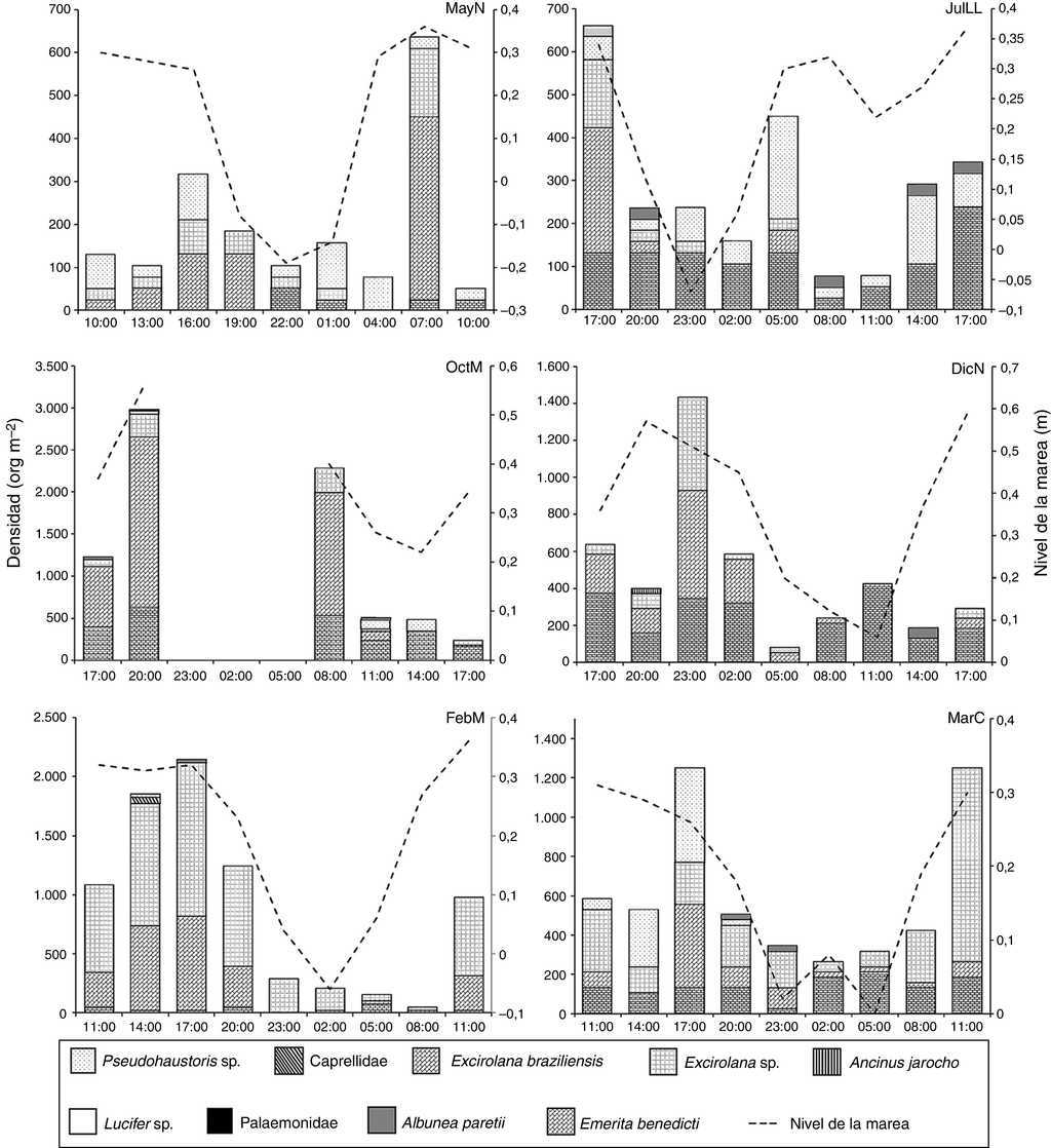 Por otra parte, Excirolana braziliensis, Excirolana sp. y Emerita benedicti se presentaron durante todas las fases y en todos los núcleos extra, esta última solo se registró preferentemente en la parte inferior de la zona no saturada. Pseudohaustorius sp. y Albunea paretii no se registraron en DicN y en MayN, respectivamente. Ancinus jarocho se registró en horas de oscuridad en DicN, Lucifer sp. y Palaemonidae solo se registraron en las horas de oscuridad de OctM y Caprellidae en horas luz de FebM (fig. 4), con densidades muy bajas. Estas 4 taxa no se consideran habitantes de las playas arenosas.